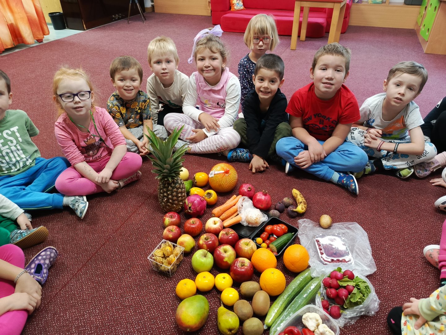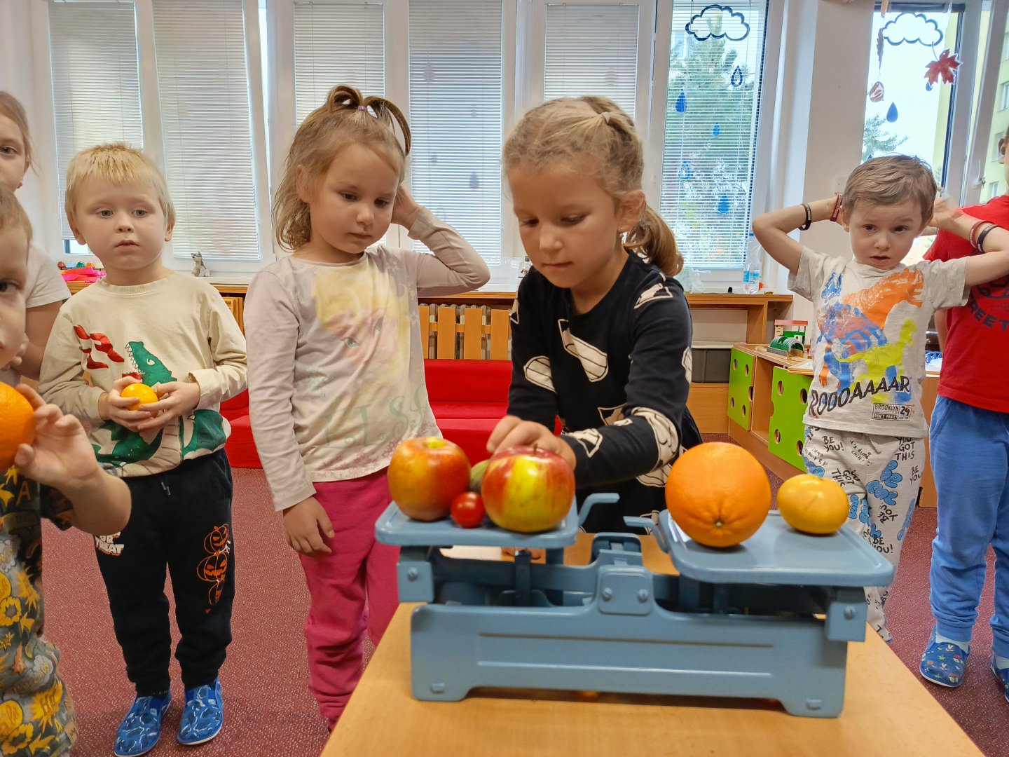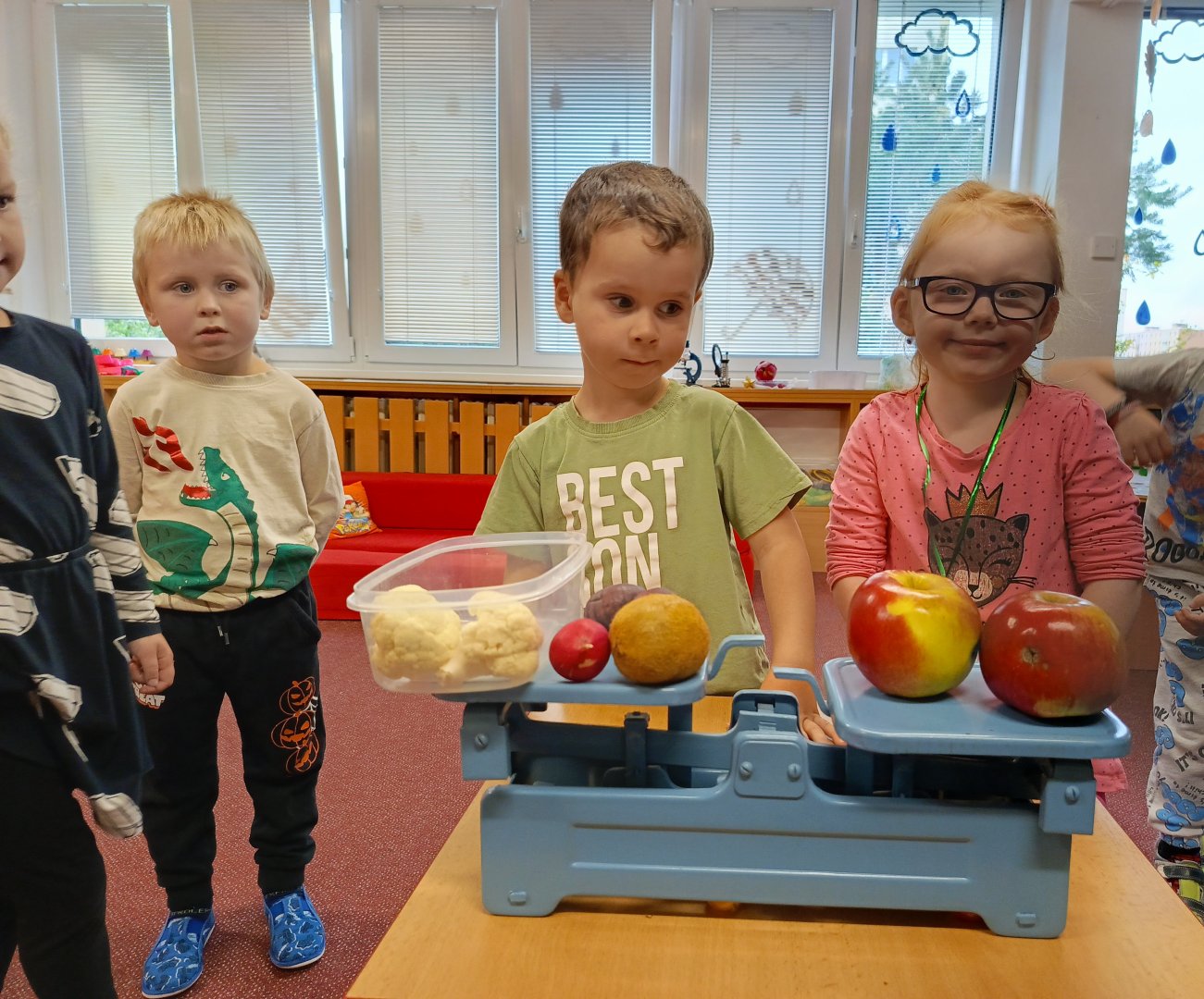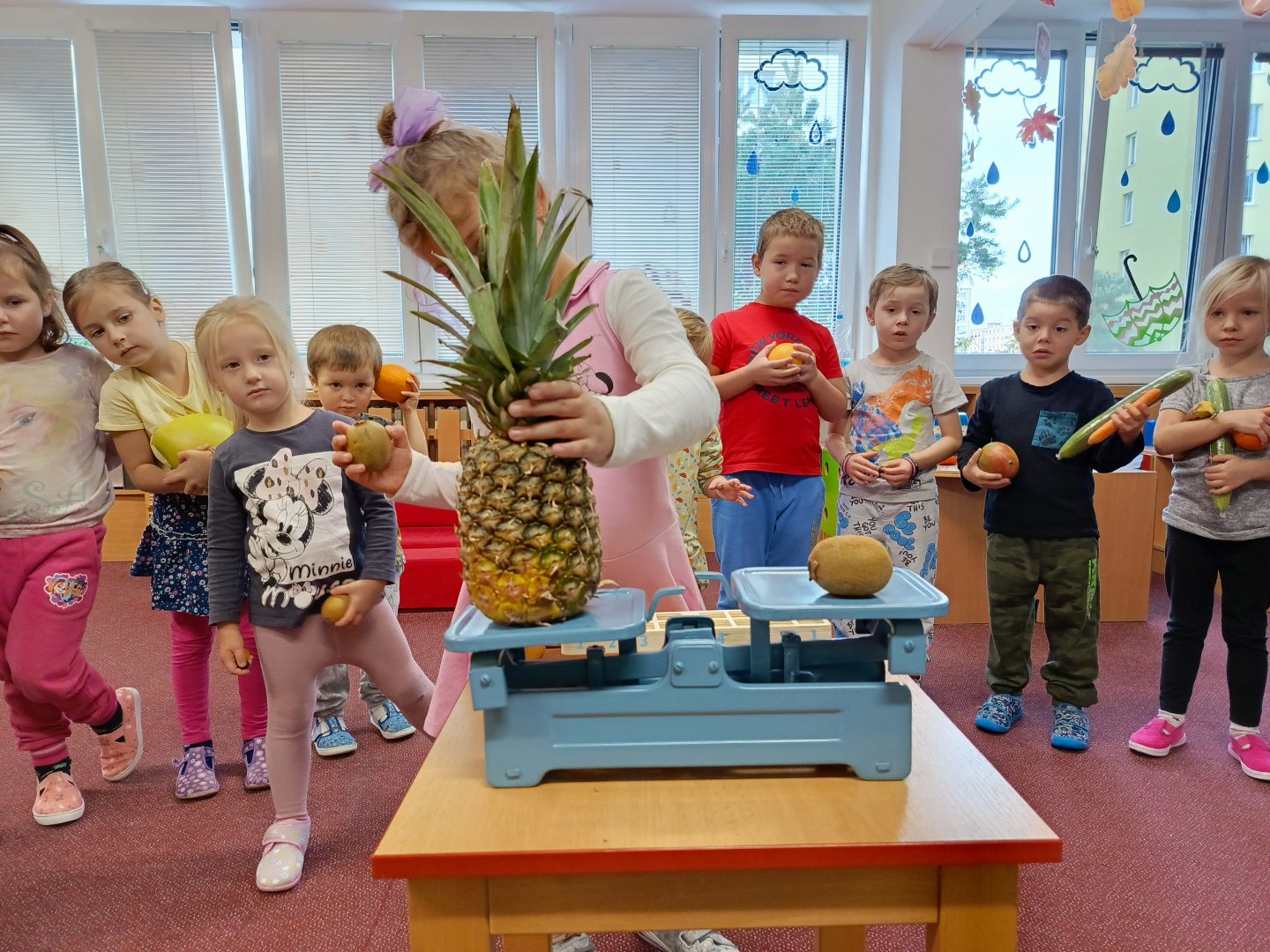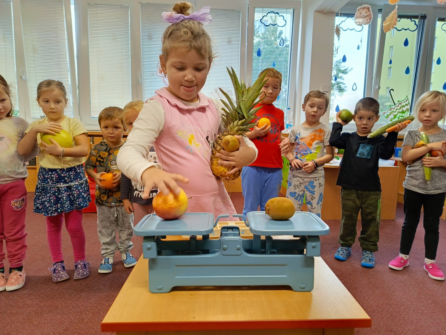Tento týden jsme se věnovali ovoci a zelenině. Děti se seznámily s různou zeleninou a ovocem i exotickým. Poznaly, že každé ovoce i zelenina má jiný tvar, vůni, chuť, je jinak těžké. Vyzkoušely si vše zvážit a vytvořit na váze rovnováhu. Také ovoce a zeleninu počítaly, pozorovaly pod lupou a mikroskopem. V pokusu, co plave a neplave, se dozvěděly, že kiwi a mrkev v obyčejné vodě neplavou, ale ve slané vodě plavou. V logopedické třídě plnily úkoly na kouzelné tabuli k tomuto tématu. Také jsme sbírali kaštany, oslavili narozeniny a svátek, ve školce proběhlo divadlo s pohádkou o podzimu.