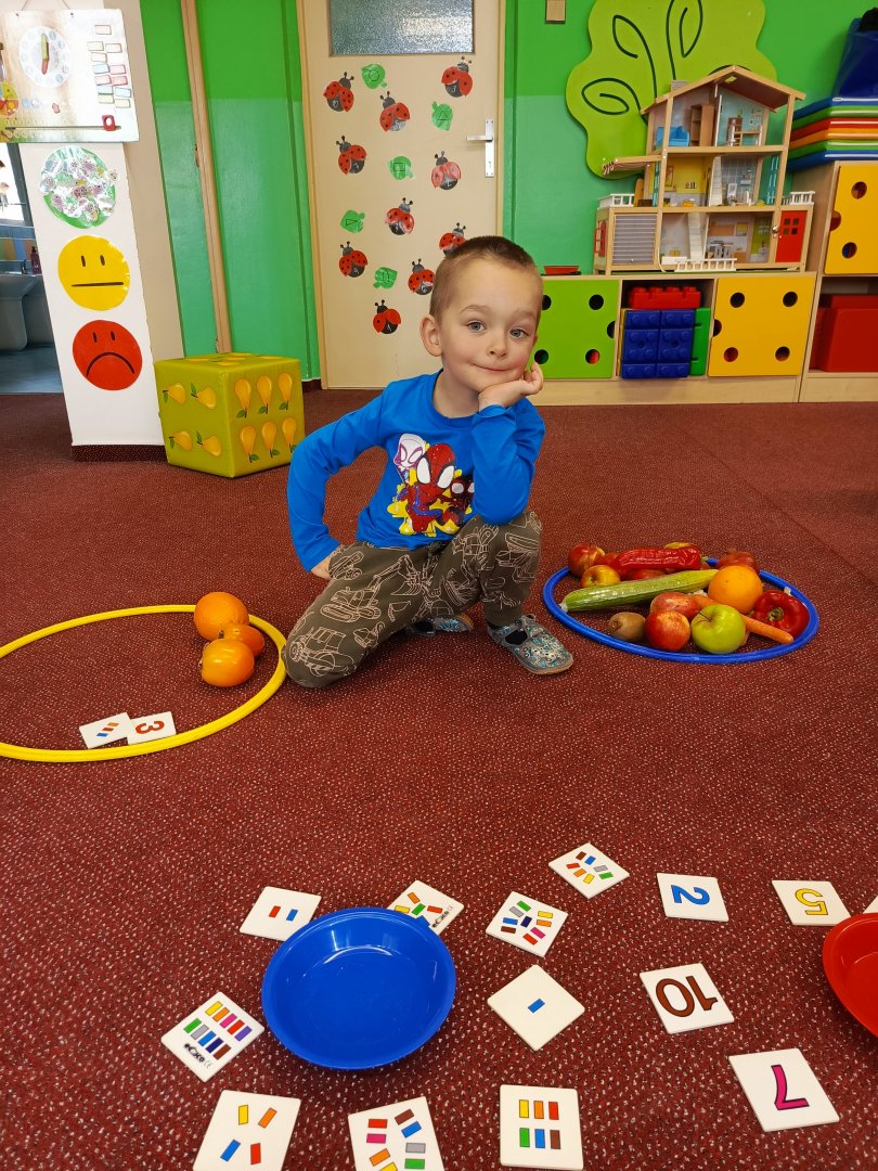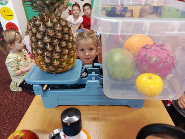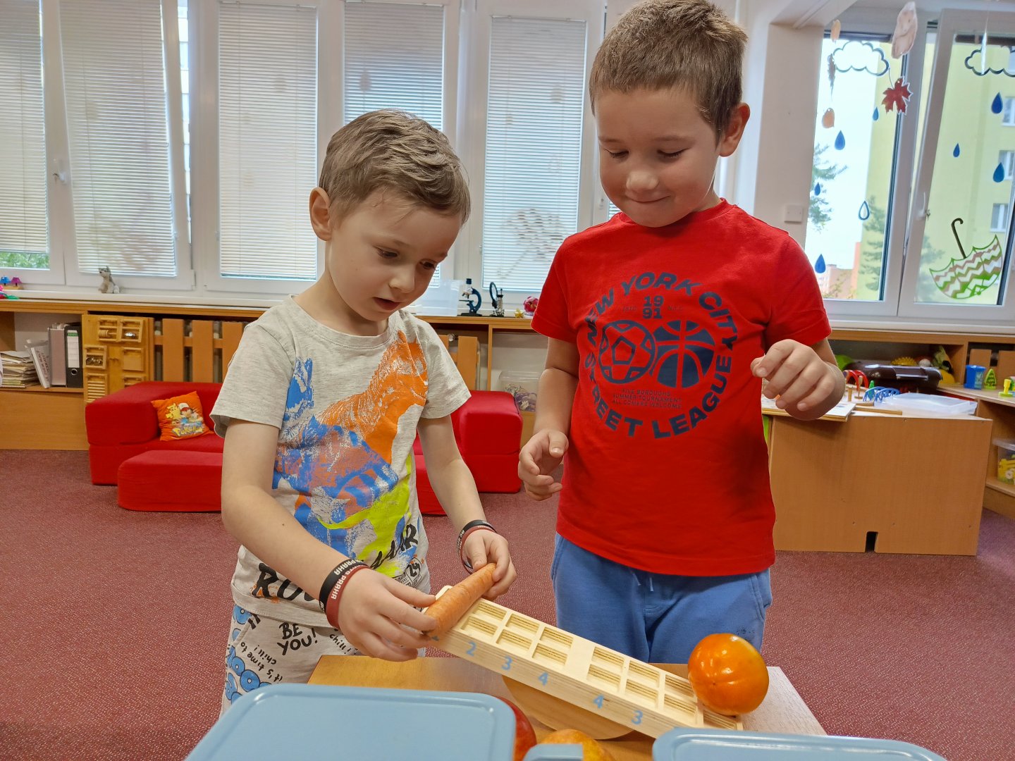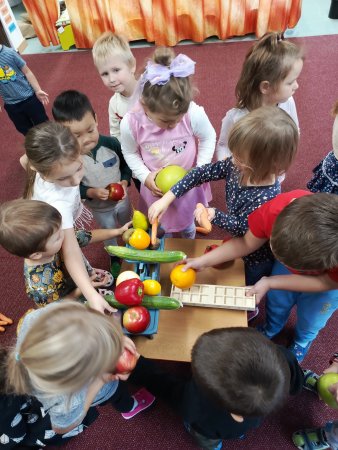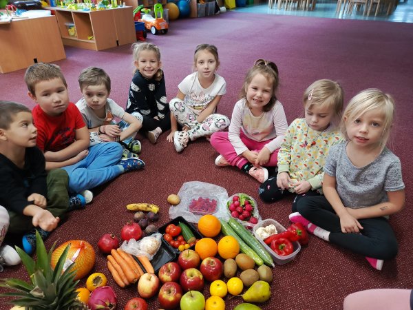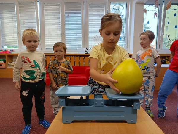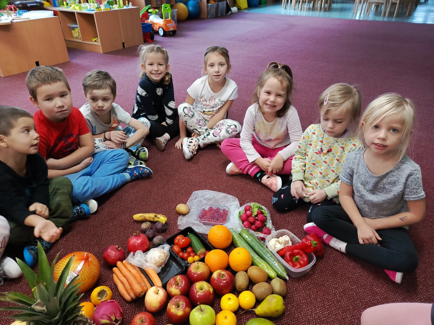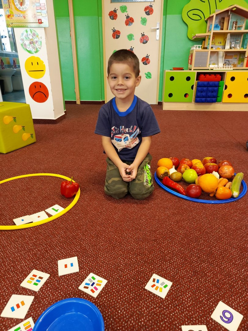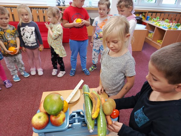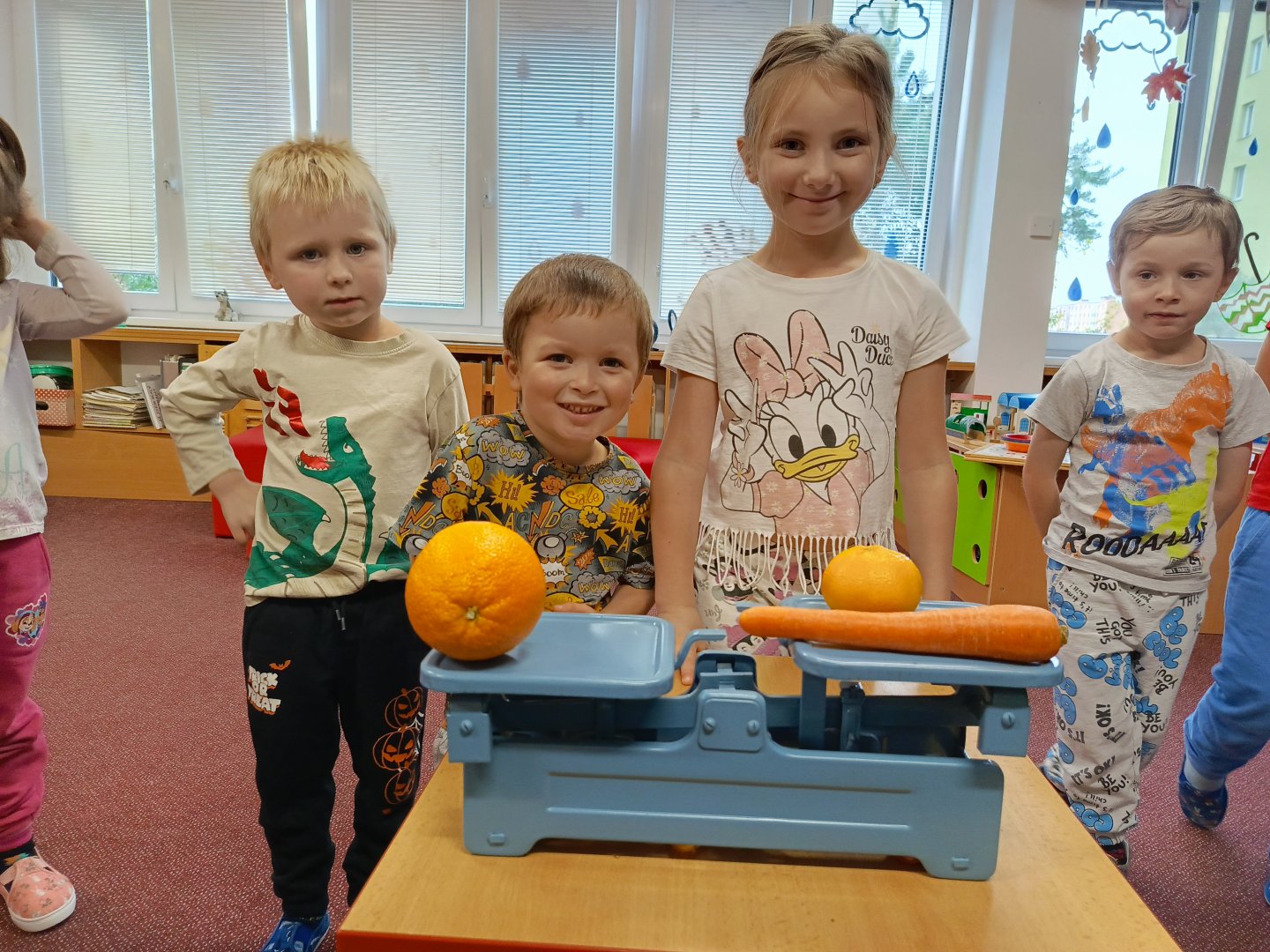 Tento týden jsme se věnovali ovoci a zelenině. Děti se seznámily s různou zeleninou a ovocem i exotickým. Poznaly, že každé ovoce i zelenina má jiný tvar, vůni, chuť, je jinak těžké. Vyzkoušely si vše zvážit a vytvořit na váze rovnováhu. Také ovoce a zeleninu počítaly, pozorovaly pod lupou a mikroskopem. V pokusu, co plave a neplave, se dozvěděly, že kiwi a mrkev v obyčejné vodě neplavou, ale ve slané vodě plavou. V logopedické třídě plnily úkoly na kouzelné tabuli k tomuto tématu. Také jsme sbírali kaštany, oslavili narozeniny a svátek, ve školce proběhlo divadlo s pohádkou o podzimu.