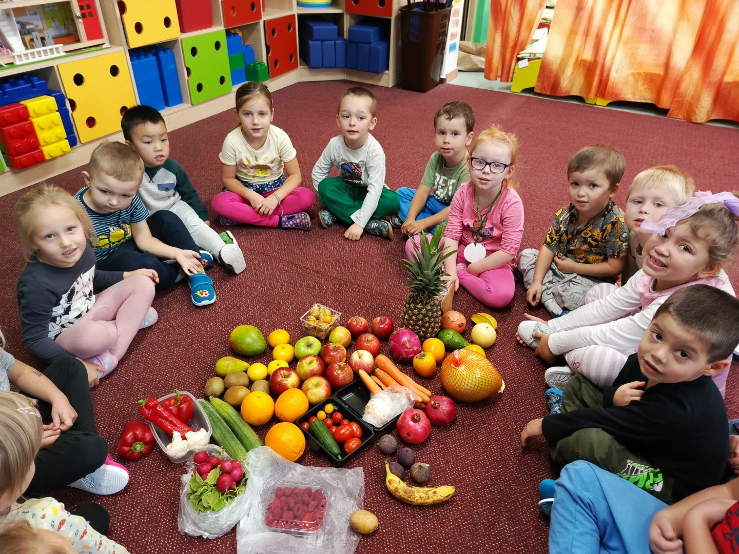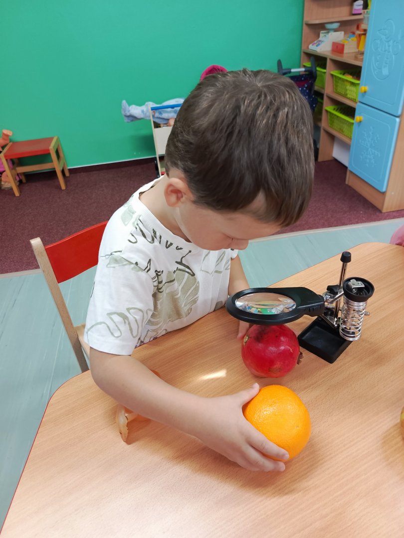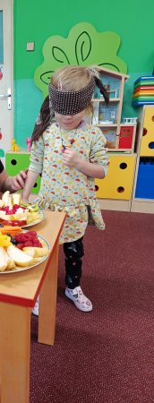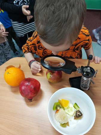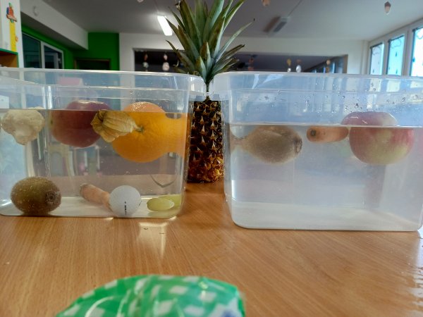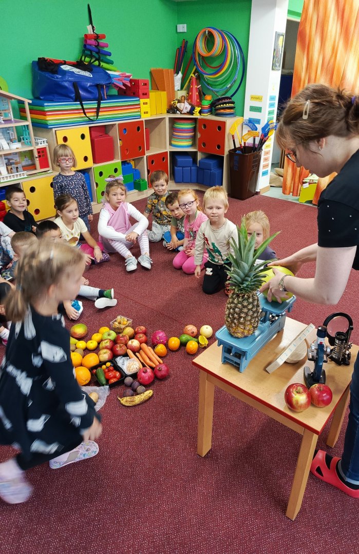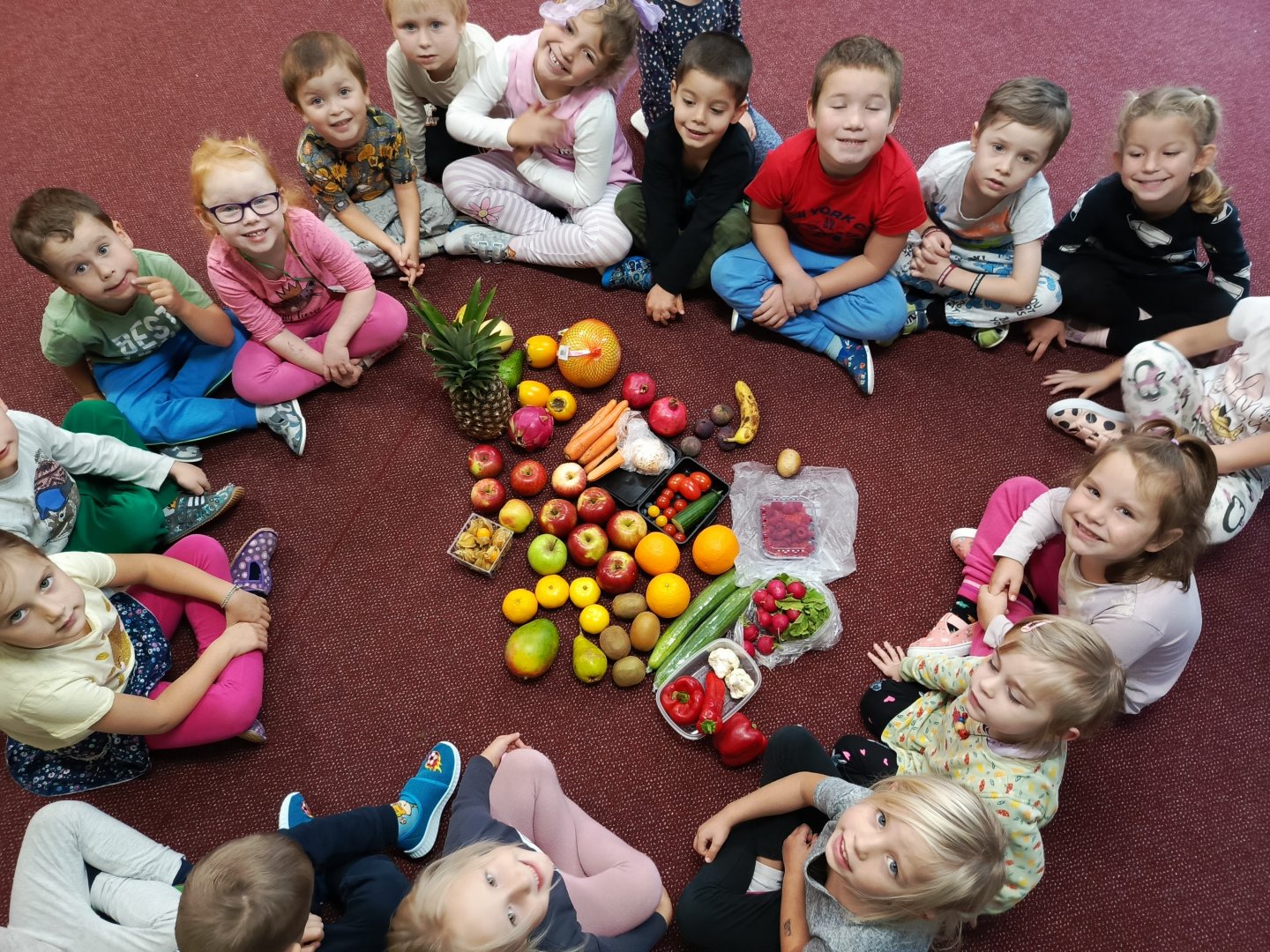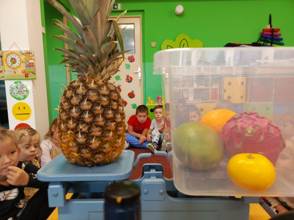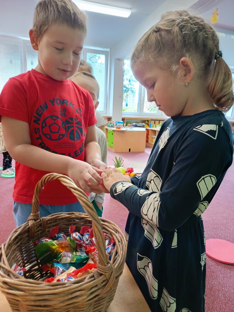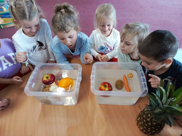 Tento týden jsme se věnovali ovoci a zelenině. Děti se seznámily s různou zeleninou a ovocem i exotickým. Poznaly, že každé ovoce i zelenina má jiný tvar, vůni, chuť, je jinak těžké. Vyzkoušely si vše zvážit a vytvořit na váze rovnováhu. Také ovoce a zeleninu počítaly, pozorovaly pod lupou a mikroskopem. V pokusu, co plave a neplave, se dozvěděly, že kiwi a mrkev v obyčejné vodě neplavou, ale ve slané vodě plavou. V logopedické třídě plnily úkoly na kouzelné tabuli k tomuto tématu. Také jsme sbírali kaštany, oslavili narozeniny a svátek, ve školce proběhlo divadlo s pohádkou o podzimu.