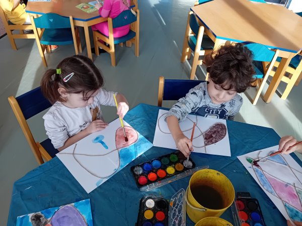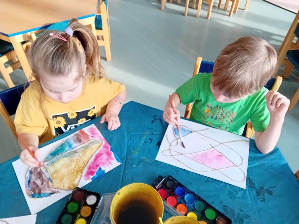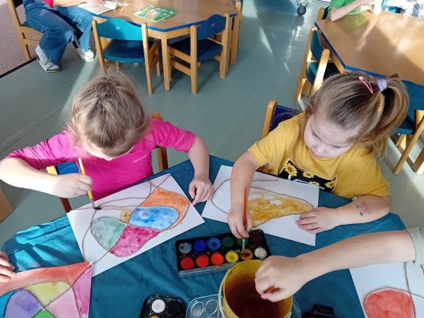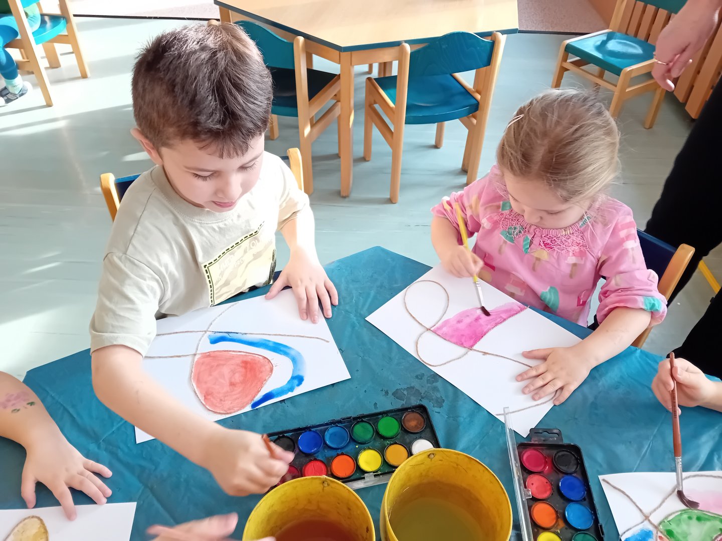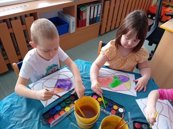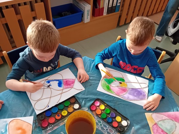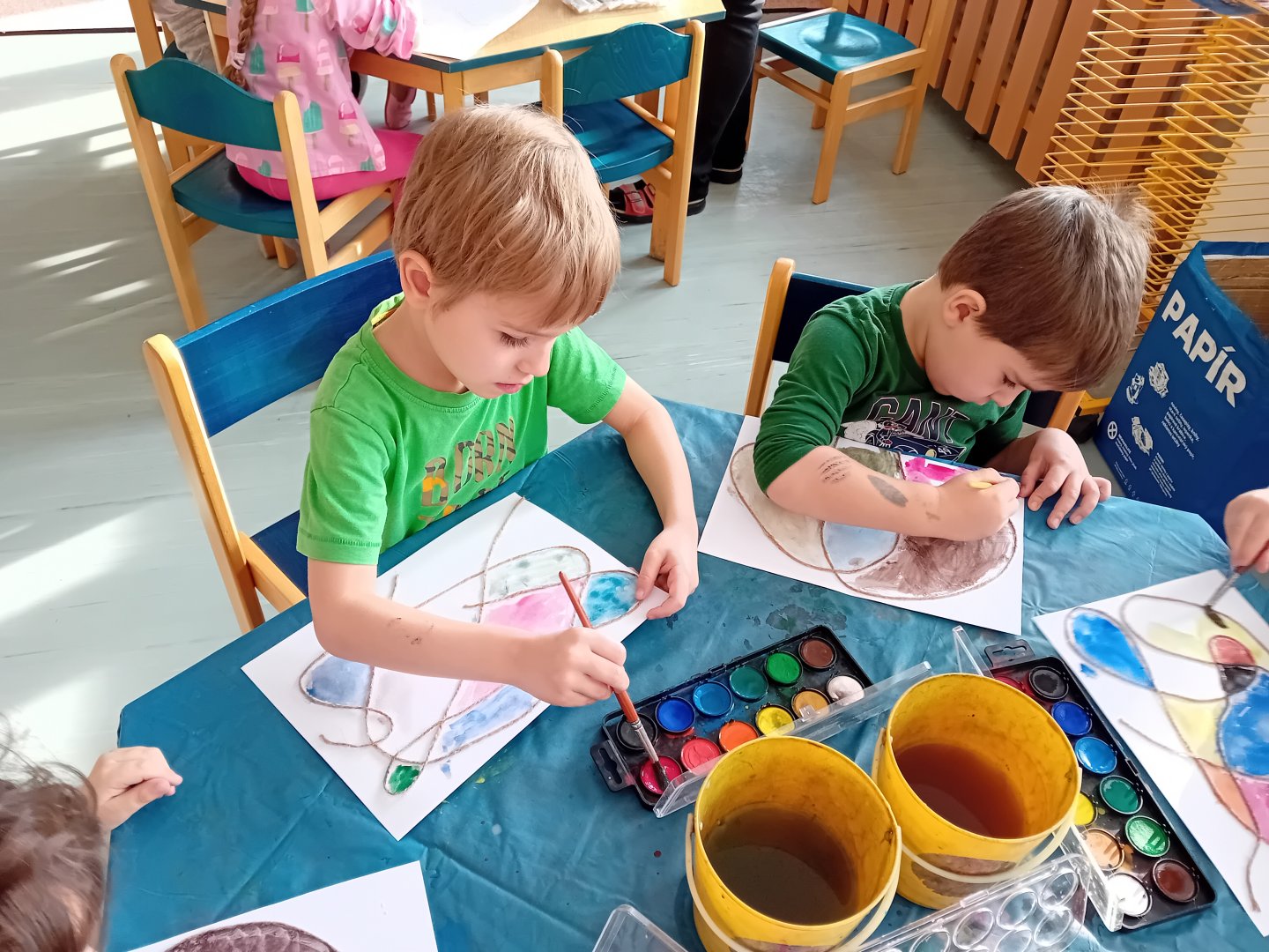 V tomto týdnu si s dětmi v rámci tématu povídáme o řemeslech a povoláních. Dnes si děti zahrály na malíře, vodovkami vybarvovaly jednotlivé části na čtvrtce, které byly rozdělené pomocí nalepeného provázku. Součástí tématu je četba pohádek o řemeslech, s dětmi si povídáme o tom, co řemeslníci potřebují ke svému povolání.