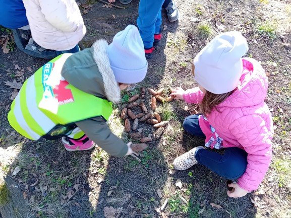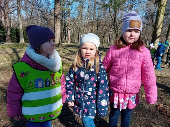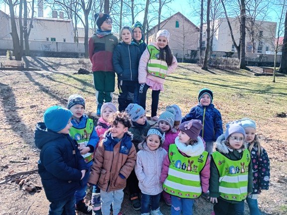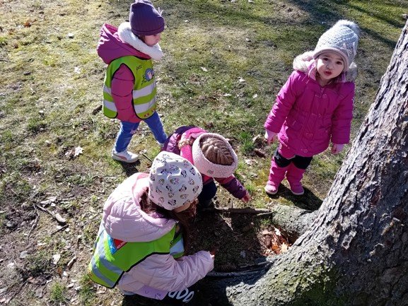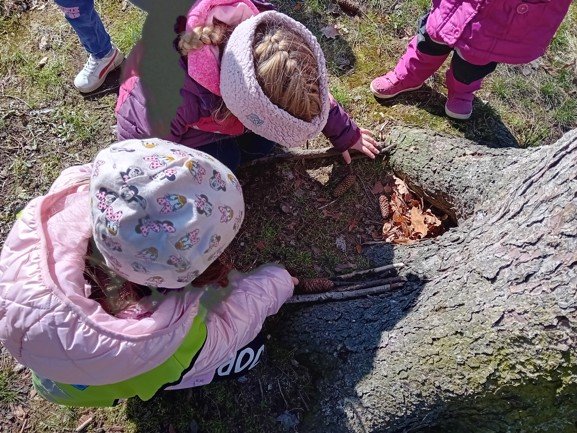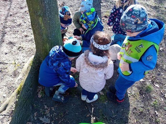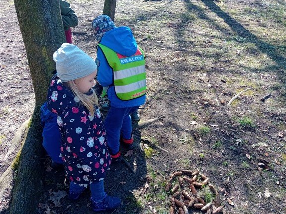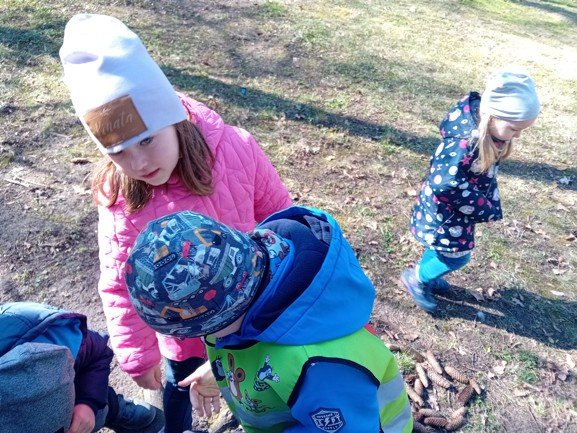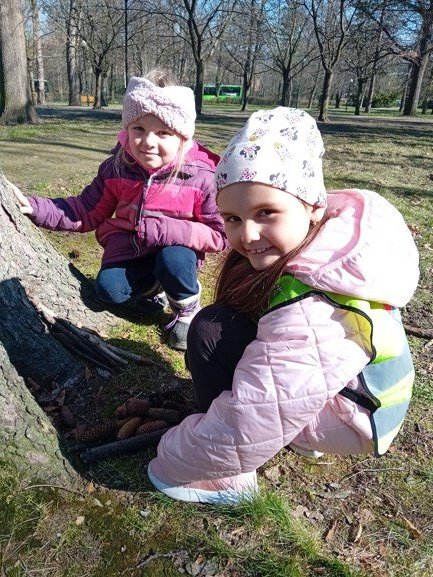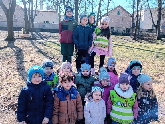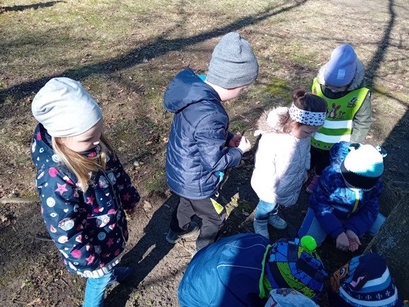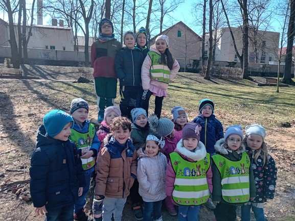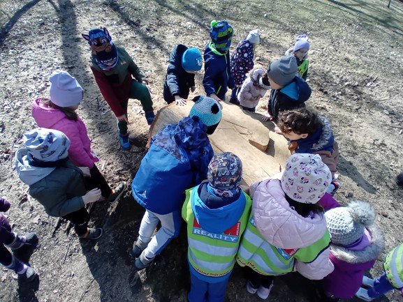 Dnes byly děti na procházce v parku, kde si postavily domečky a bludiště ze šišek a klacíků pro broučky. Hledaly také jarní květiny, přivoněly si k fialkám. Prohlédly si velký pařez a zkoušely na něm počítat letokruhy. Také si zahrály v parku pohybové hry.