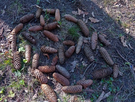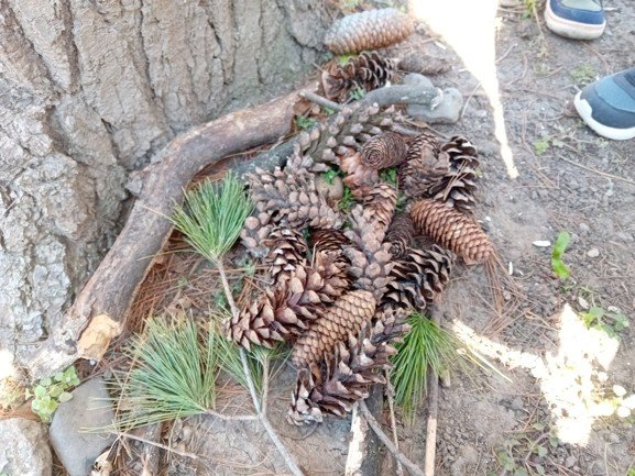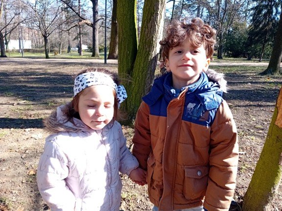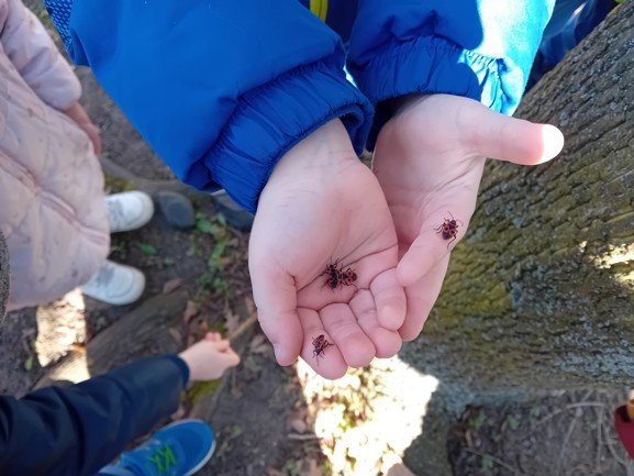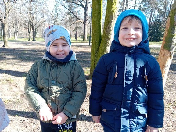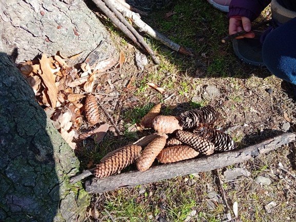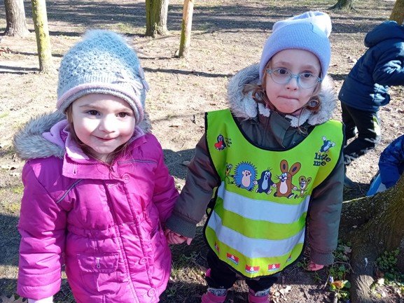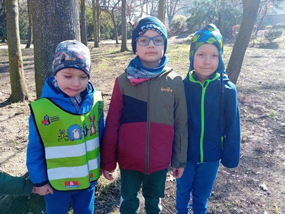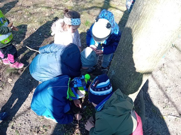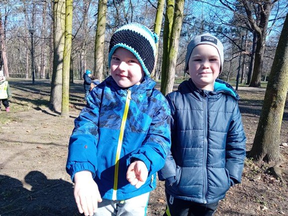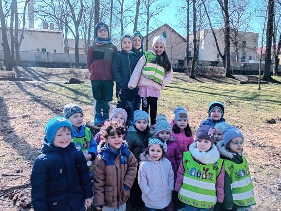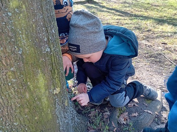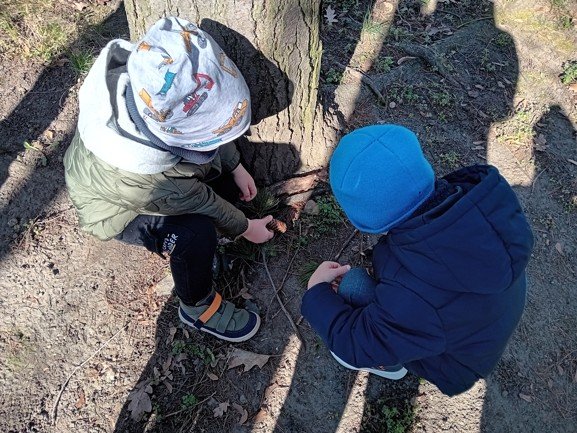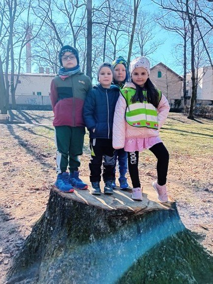 Dnes byly děti na procházce v parku, kde si postavily domečky a bludiště ze šišek a klacíků pro broučky. Hledaly také jarní květiny, přivoněly si k fialkám. Prohlédly si velký pařez a zkoušely na něm počítat letokruhy. Také si zahrály v parku pohybové hry.