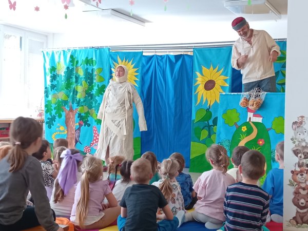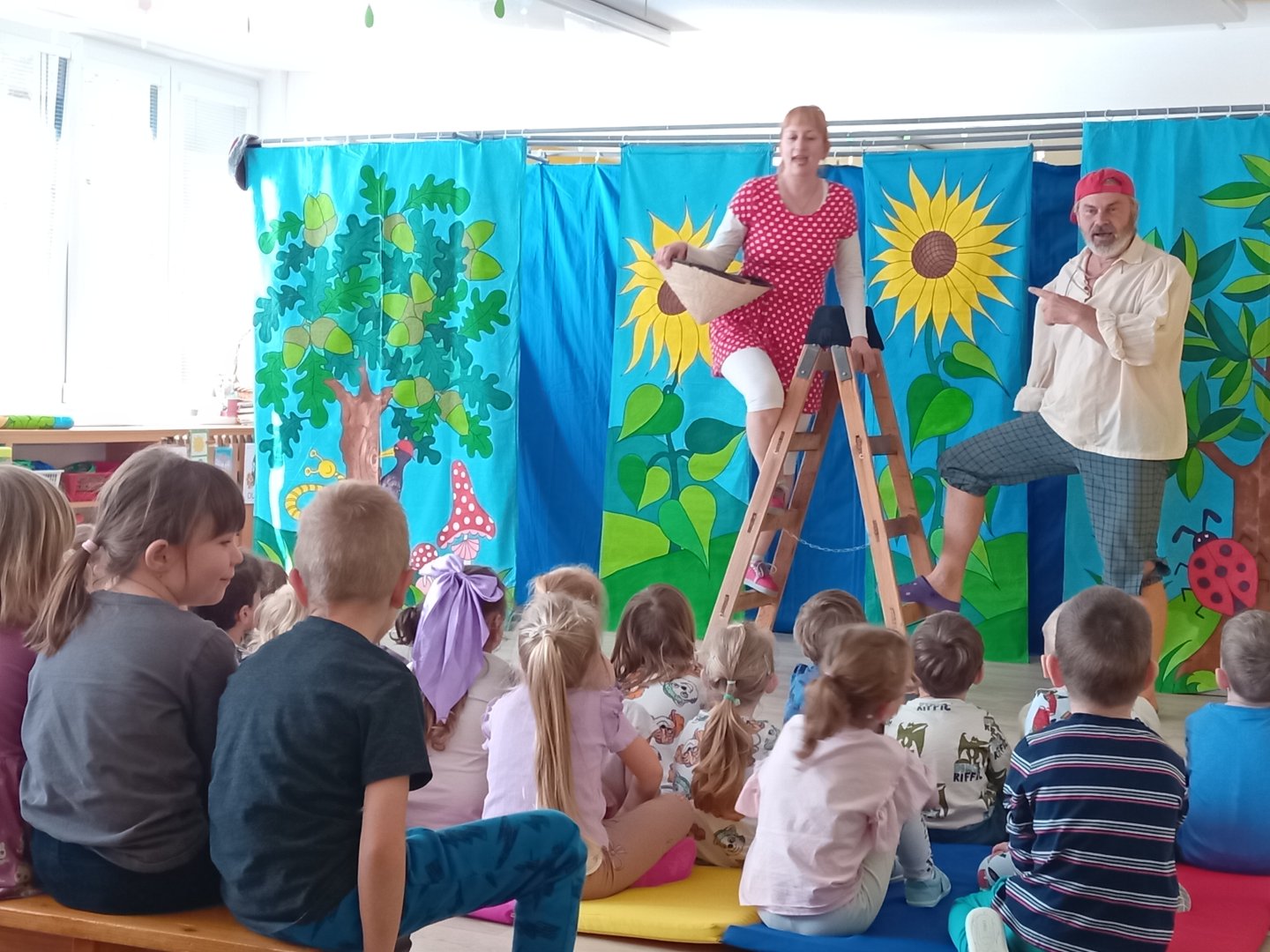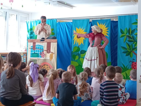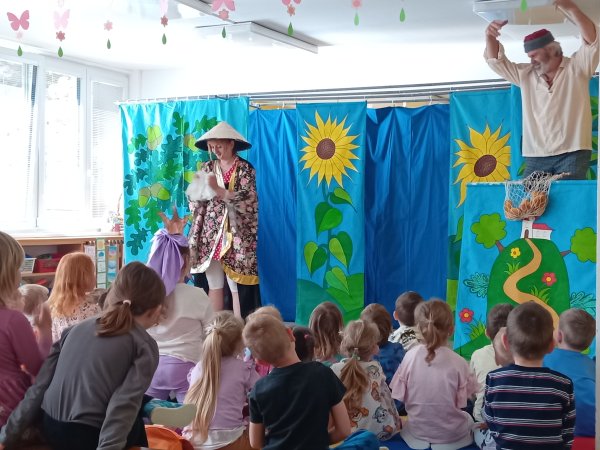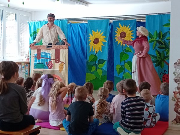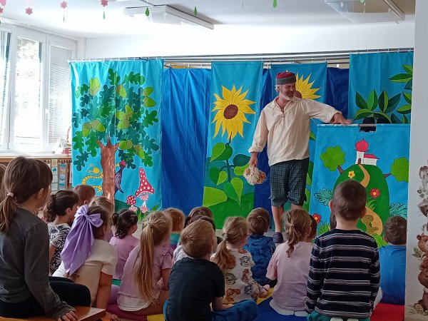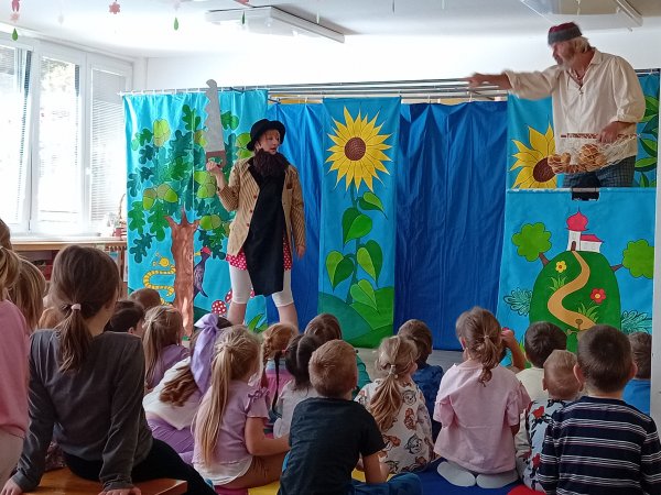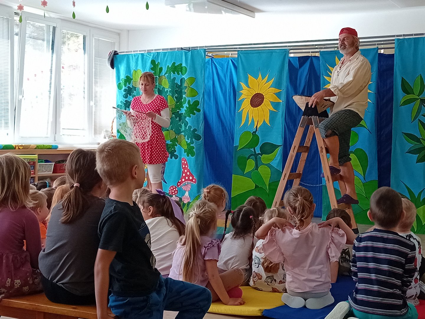 Dnes za dětmi do školky dorazilo divadlo "Kolem" s pohádkou "Co je pravda, co je lež". Pohádka byla o veselém Honzovi a Kačence, kteří si navzájem lhali, ale protože lež má krátké nohy, tak se vše dobře dopadlo. Dětem se představení líbilo a herce odměnily potleskem.