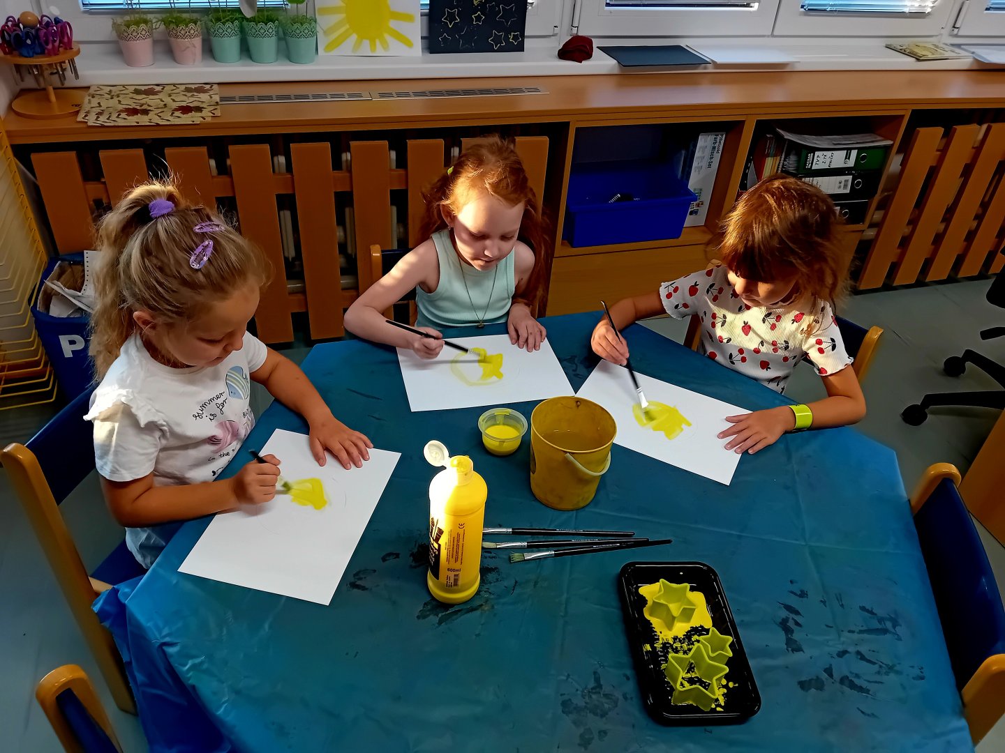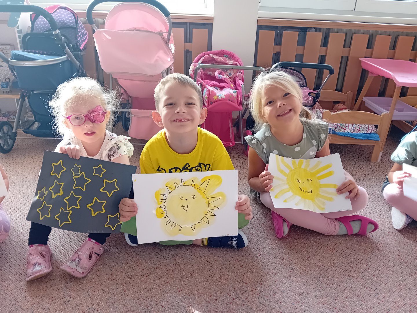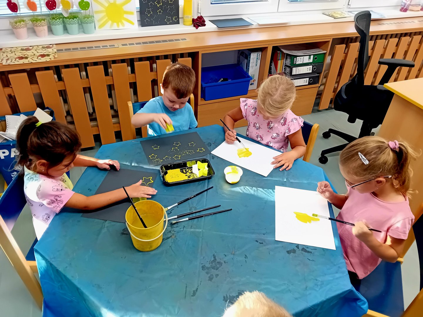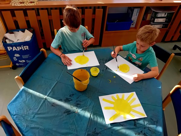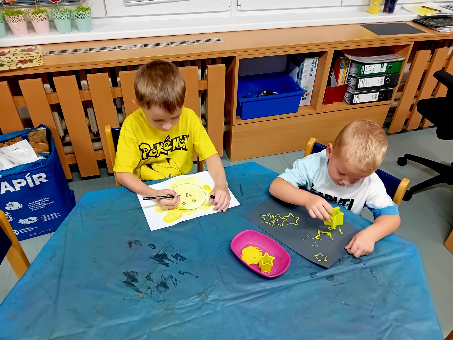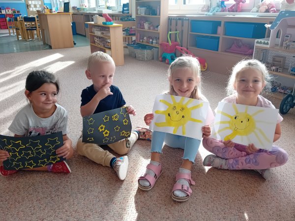 Od začátku školního roku se děti seznamují s prostředím třídy, se svými kamarády, s jejich jmény a také se věnují týdenním tématům. V tomto týdnu je to téma "Jak správně běží den za dnem", kdy se děti učí chápat elementární časové pojmy - dnes, včera, zítra, ráno, večer apod. Děti si vyrobily slunce a hvězdy. Slunce malovaly štětcem a temperou a hvězdy tiskaly pomocí vykrajovátek. Také se naučily báseň "V noci", zpívají písně s doprovodem piana, hrají pohybové hry. Při vycházkách poznávají okolí mateřské školy, učí se chodit ve dvojicích a také jak bezpečně přecházet přes silnici.