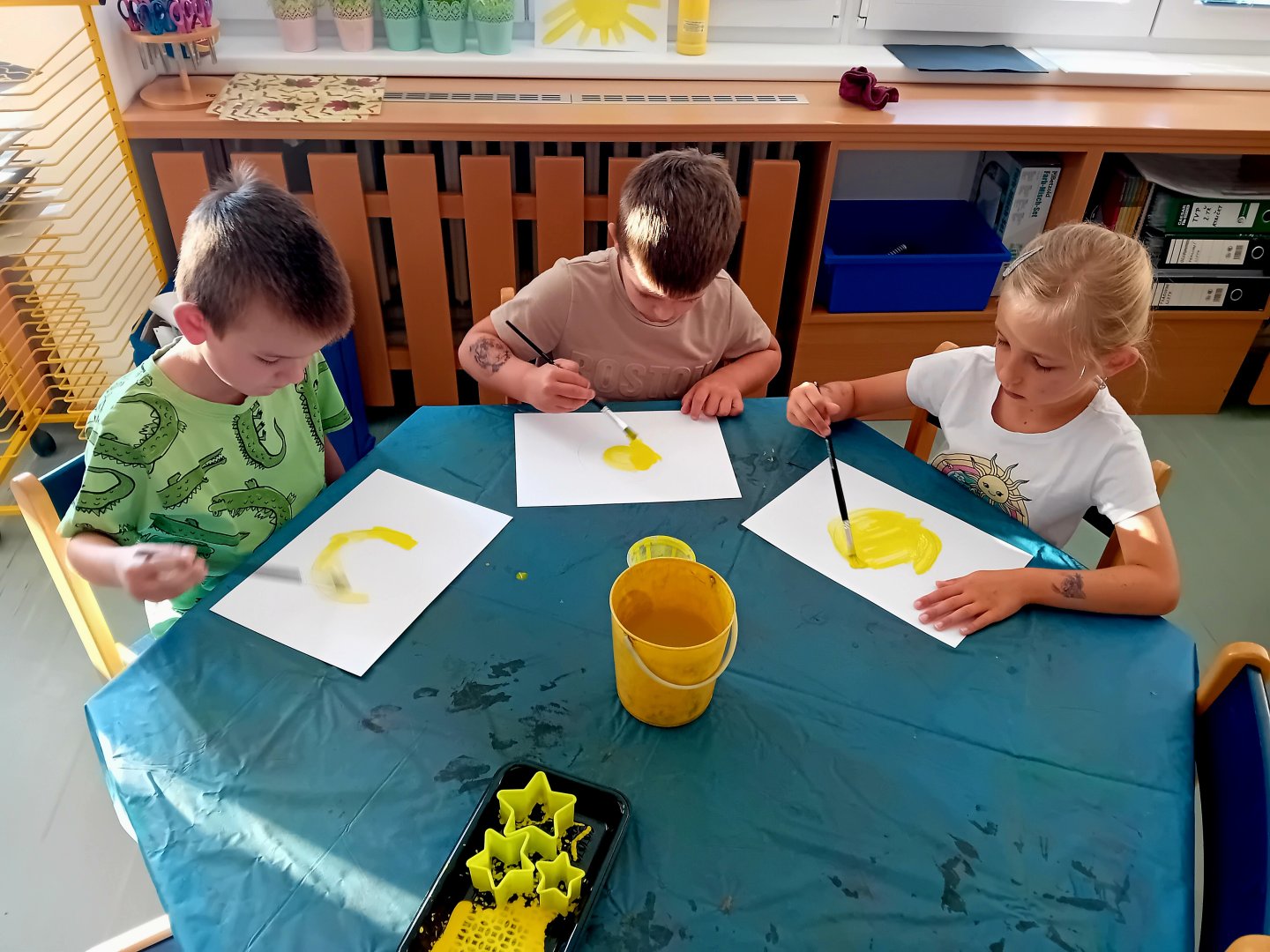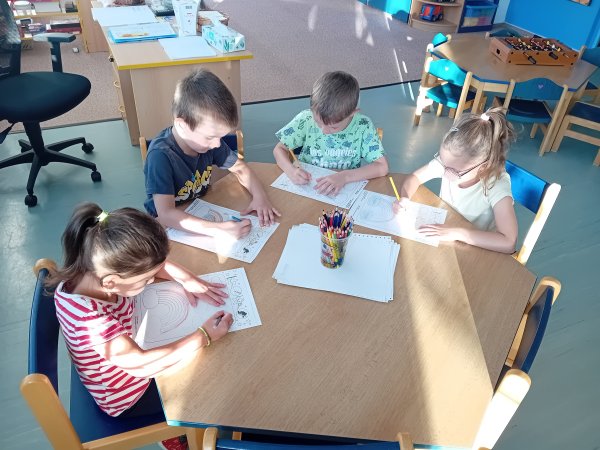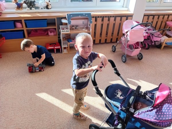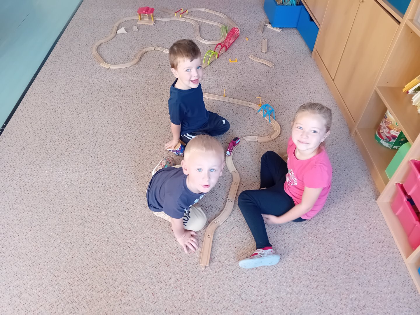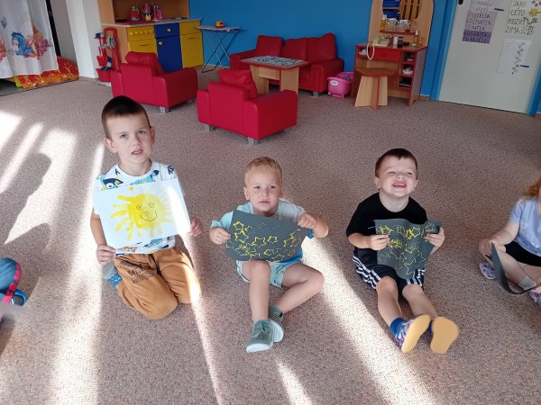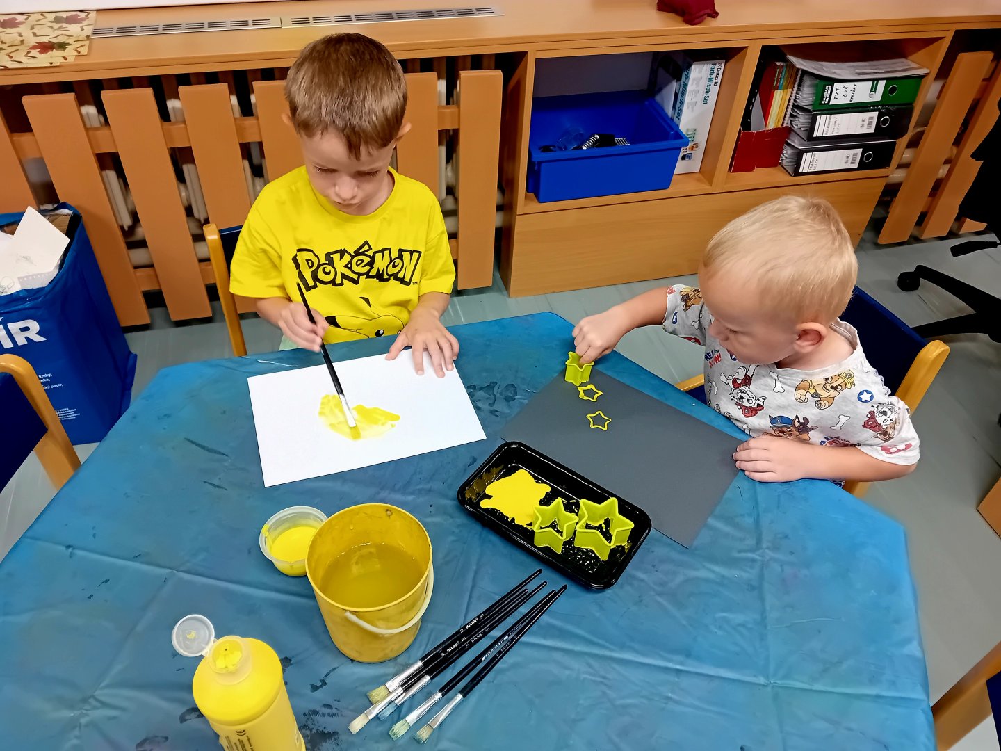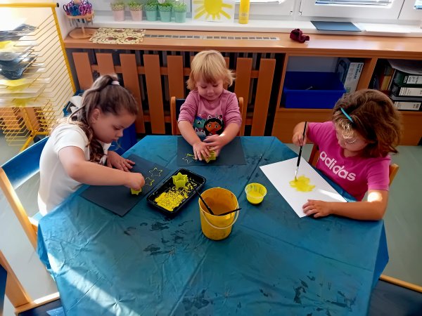Od začátku školního roku se děti seznamují s prostředím třídy, se svými kamarády, s jejich jmény a také se věnují týdenním tématům. V tomto týdnu je to téma "Jak správně běží den za dnem", kdy se děti učí chápat elementární časové pojmy - dnes, včera, zítra, ráno, večer apod. Děti si vyrobily slunce a hvězdy. Slunce malovaly štětcem a temperou a hvězdy tiskaly pomocí vykrajovátek. Také se naučily báseň "V noci", zpívají písně s doprovodem piana, hrají pohybové hry. Při vycházkách poznávají okolí mateřské školy, učí se chodit ve dvojicích a také jak bezpečně přecházet přes silnici.