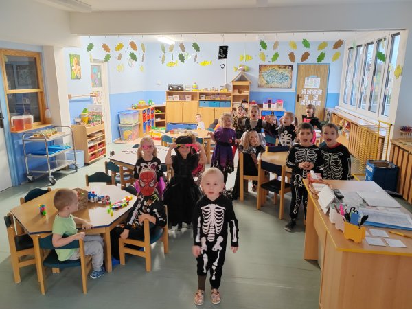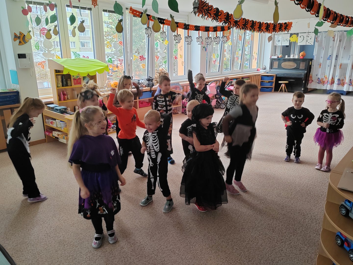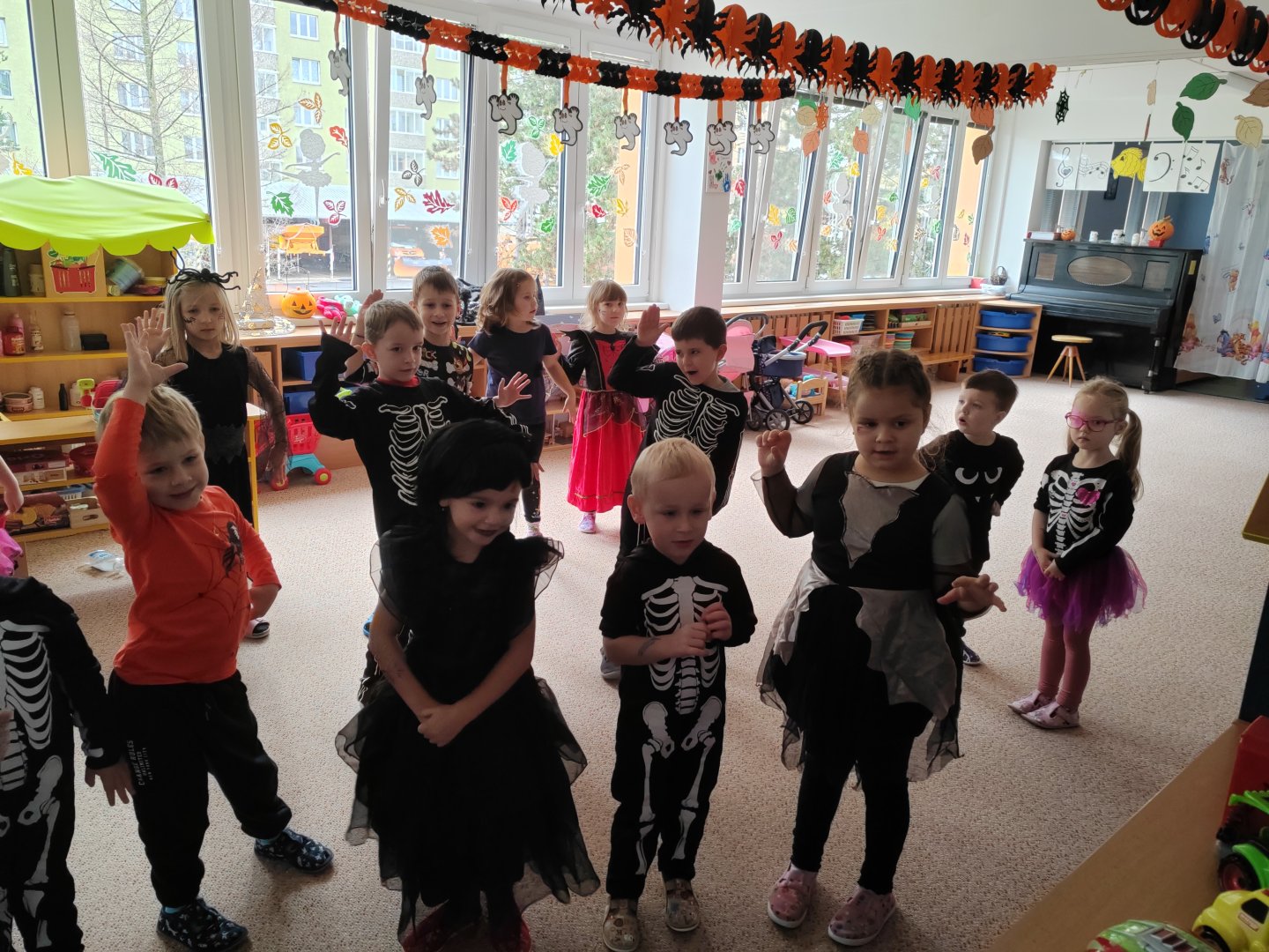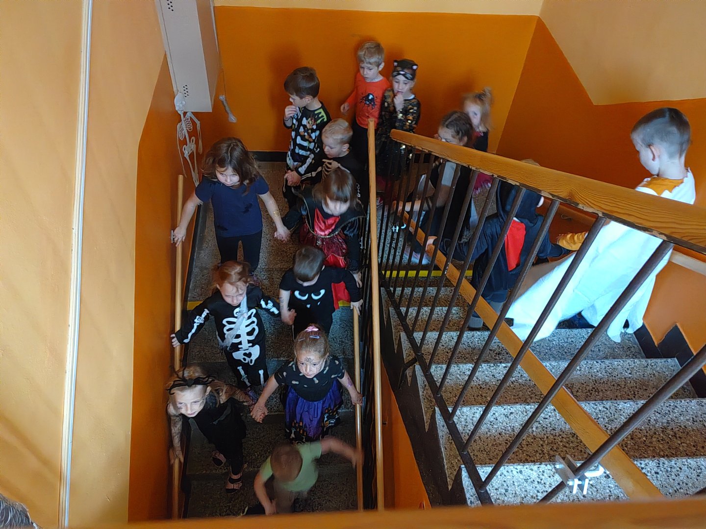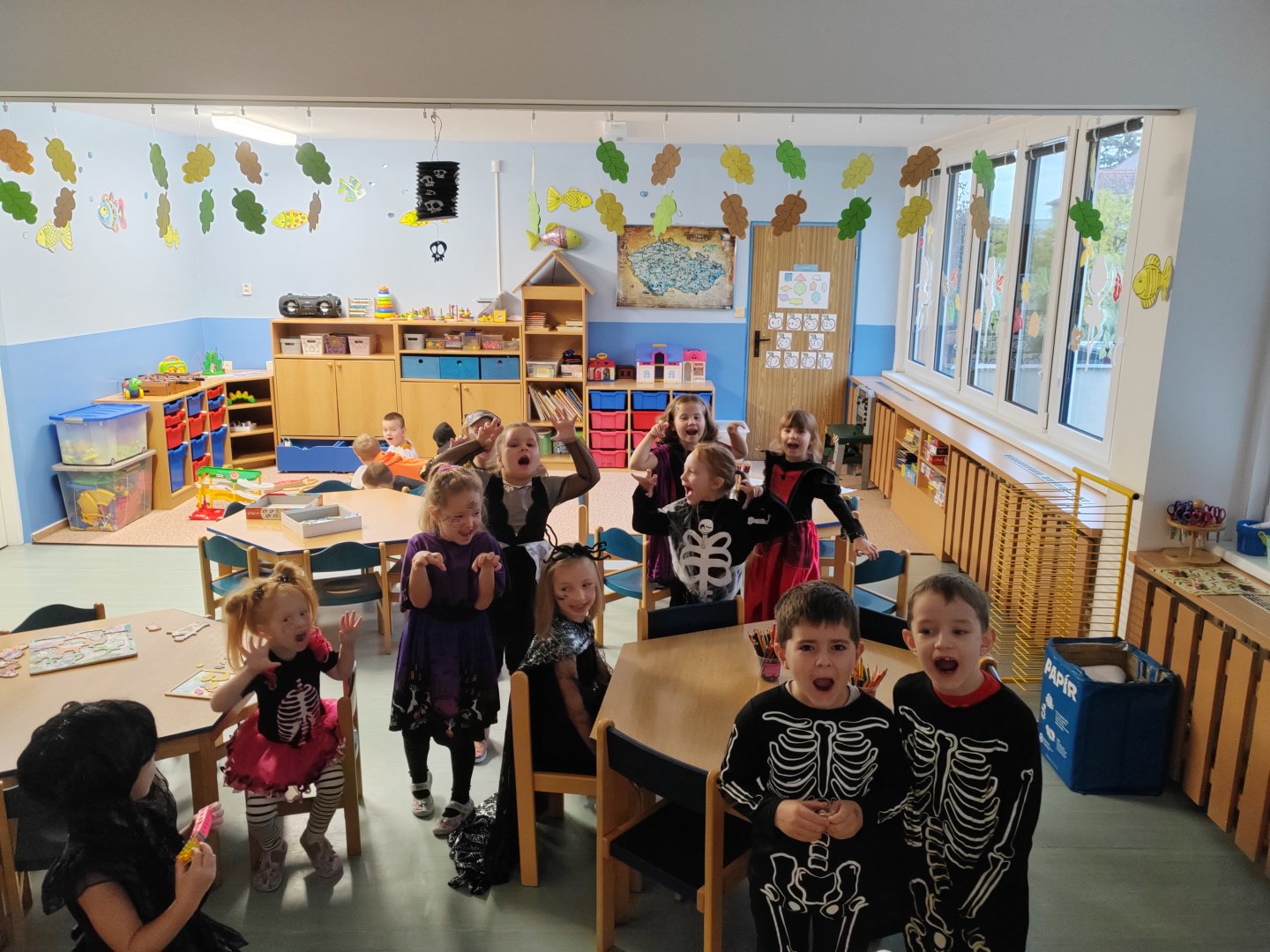 Dnes měly děti ve školce projektový den Halloween. Děti chodily už od rána do školky v nádherných maskách, nosily pro kamarády strašidelné dobroty. Tančily a skotačily. Jako překvapení na děti čekala stezka vedoucí po celé školce. Byla plná strašidýlek, úkolů a zvukových efektů. Stezku si pro děti připravila paní učitelka Míša že třídy sluníček, byla opravdu povedená. Paní učitelce moc děkujeme. Dětem se dopoledne velice líbilo. Strašně děkujeme rodičům za výborné ňaminy, nádherné kostýmy a krásně nazdobené a vydlabané dýně, které nám zdobí vchod do školky.
