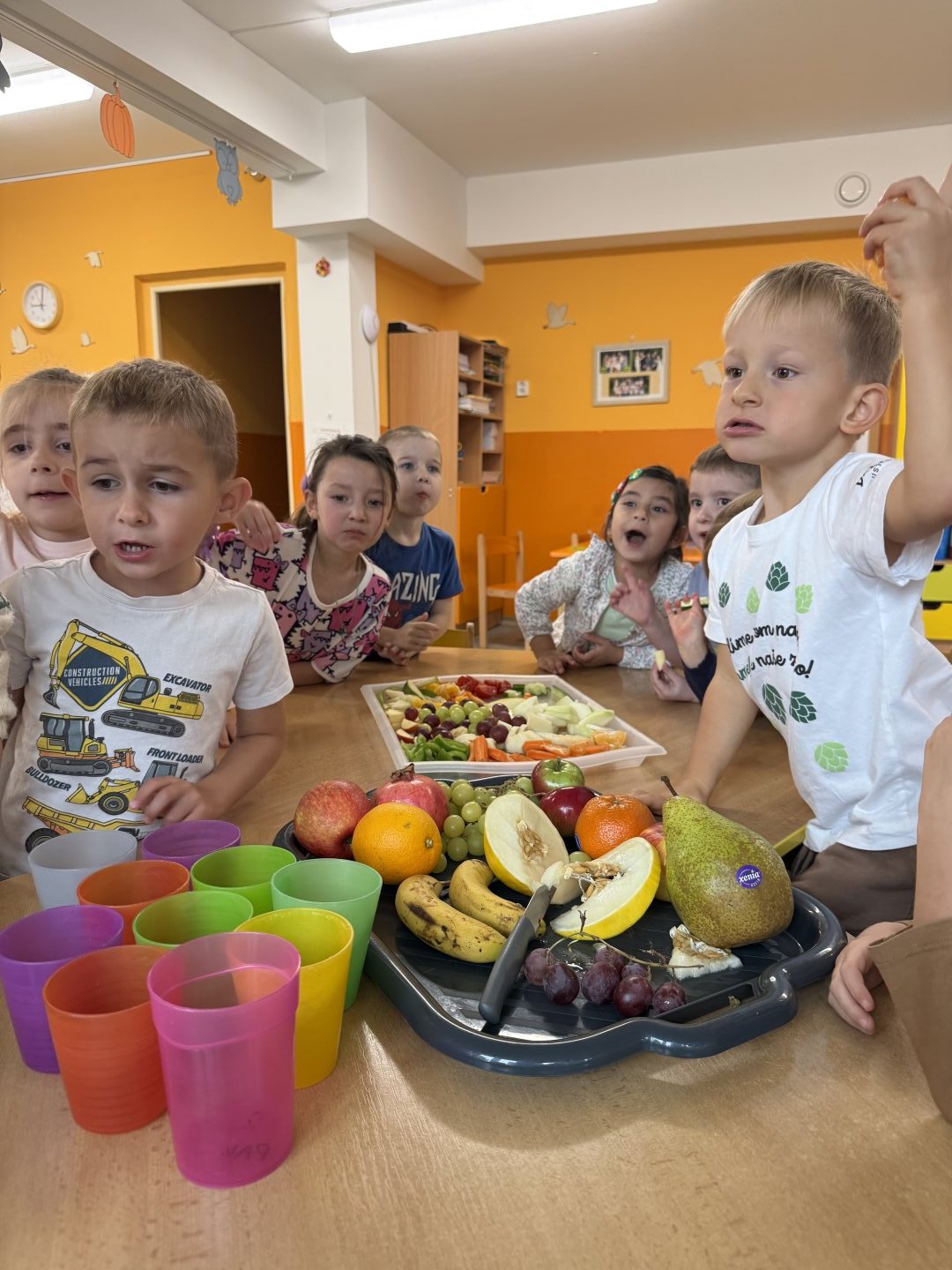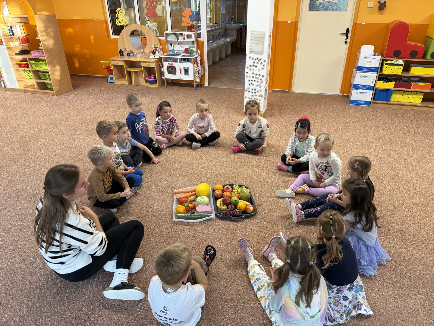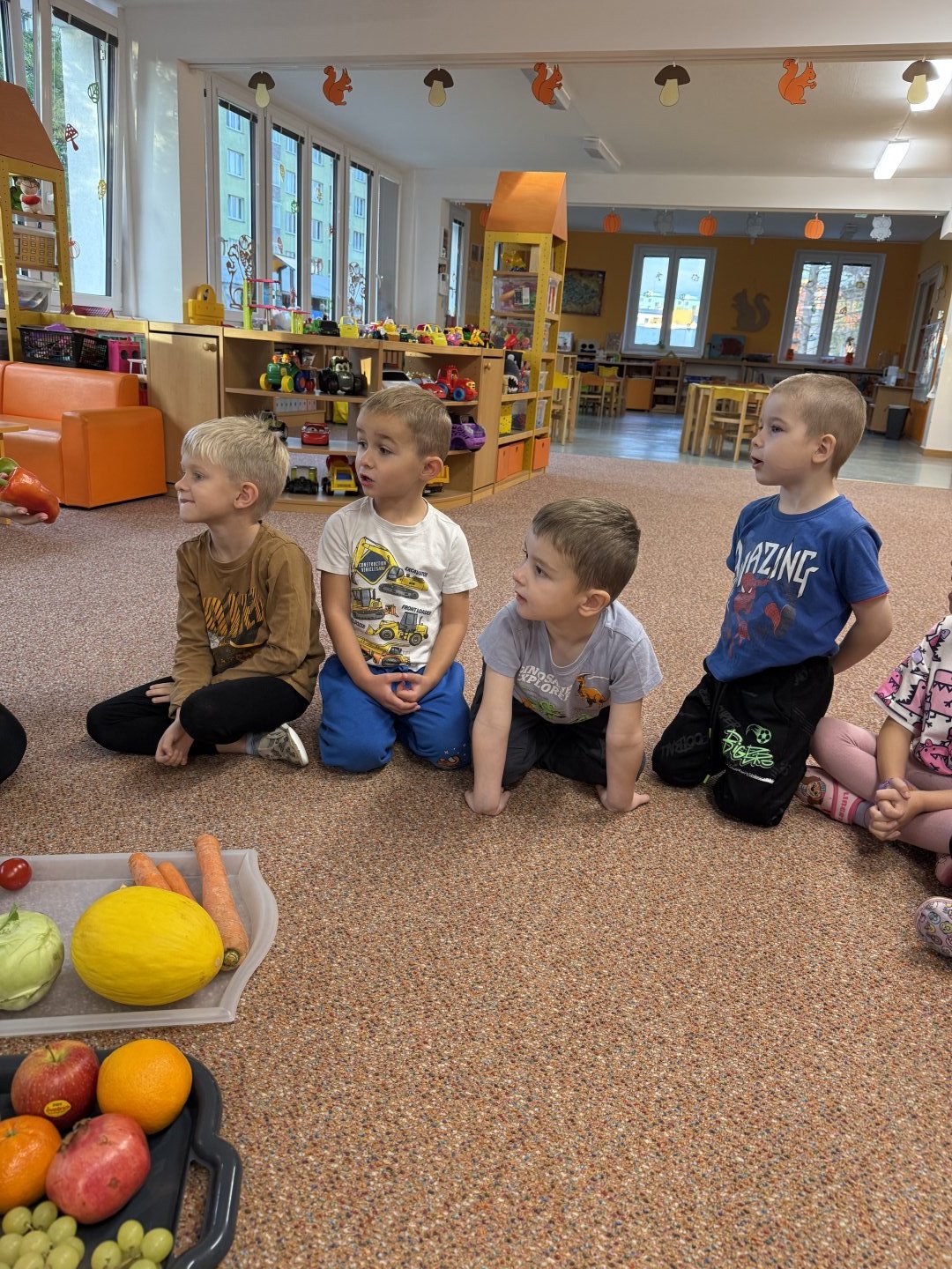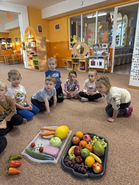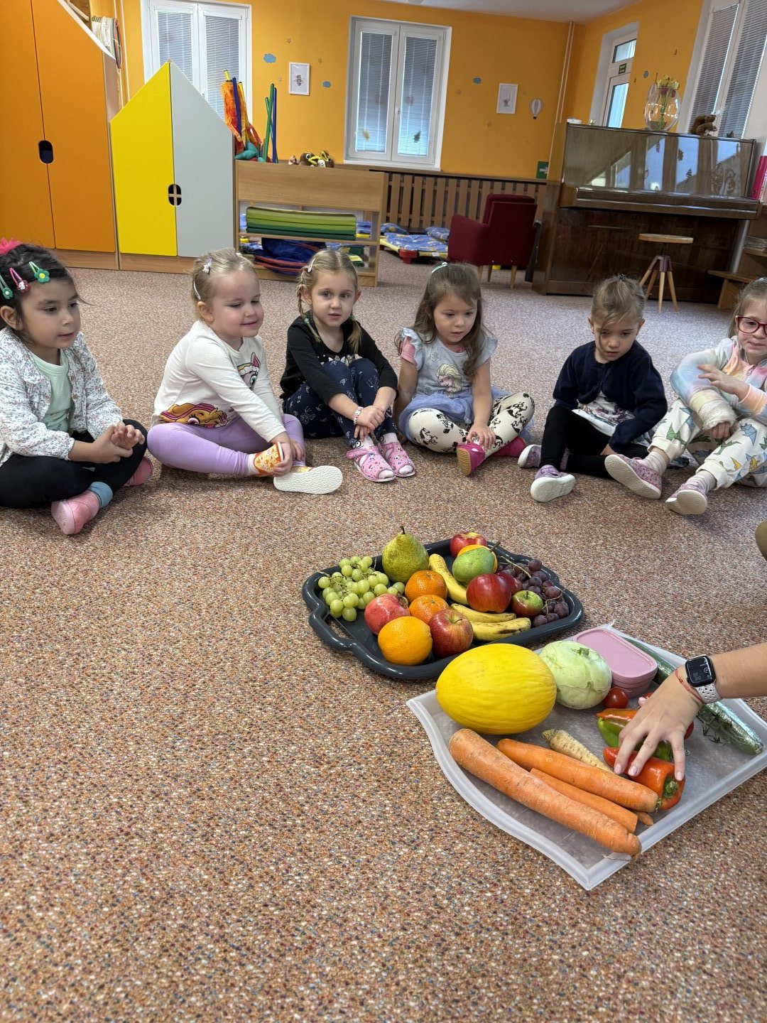 Dnes jsme si s dětmi užili barevné dopoledne plné chutí a vůní! Společně jsme poznávali různé druhy ovoce a zeleniny, zkoumali jsme, jak vypadají, jak voní a jak chutnají. Děti třídily jednotlivé druhy podle barvy, tvaru i podle toho, zda jde o ovoce nebo zeleninu. Děti poznávaly hlavně pomocí smyslu, pomocí škrabošky museli uhádnout co mají v puse (pokud děti škrabošku nechtěly, nenutili jsme a pouze zavřely oči).