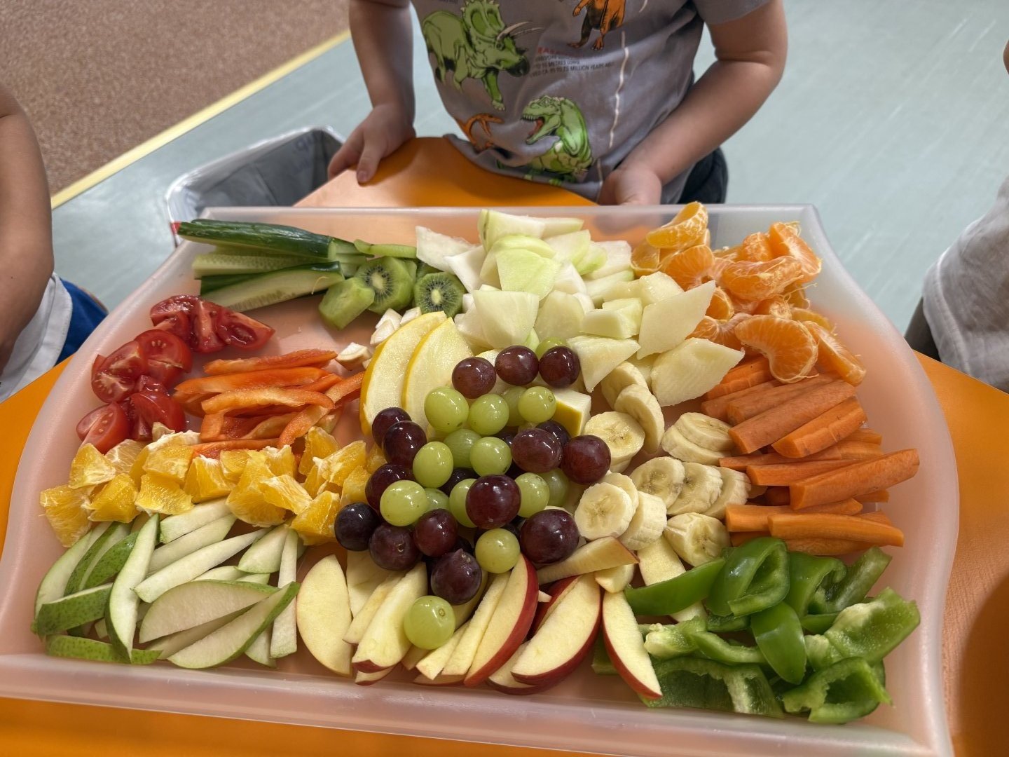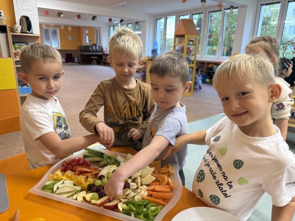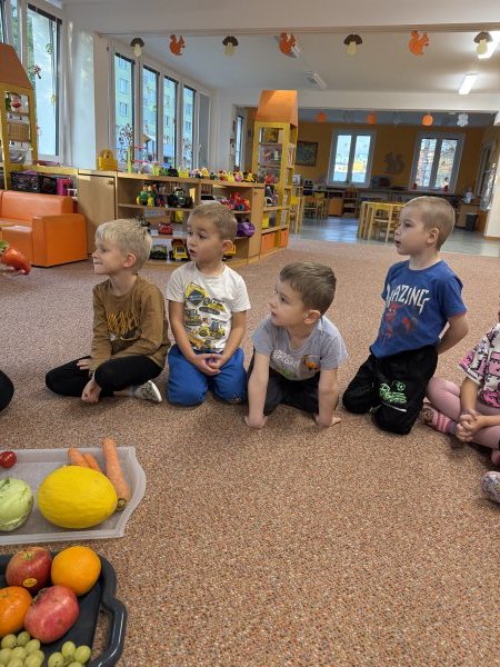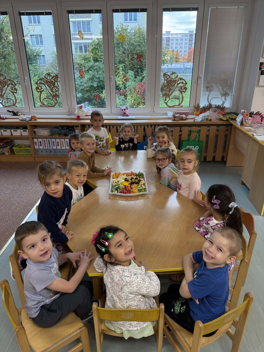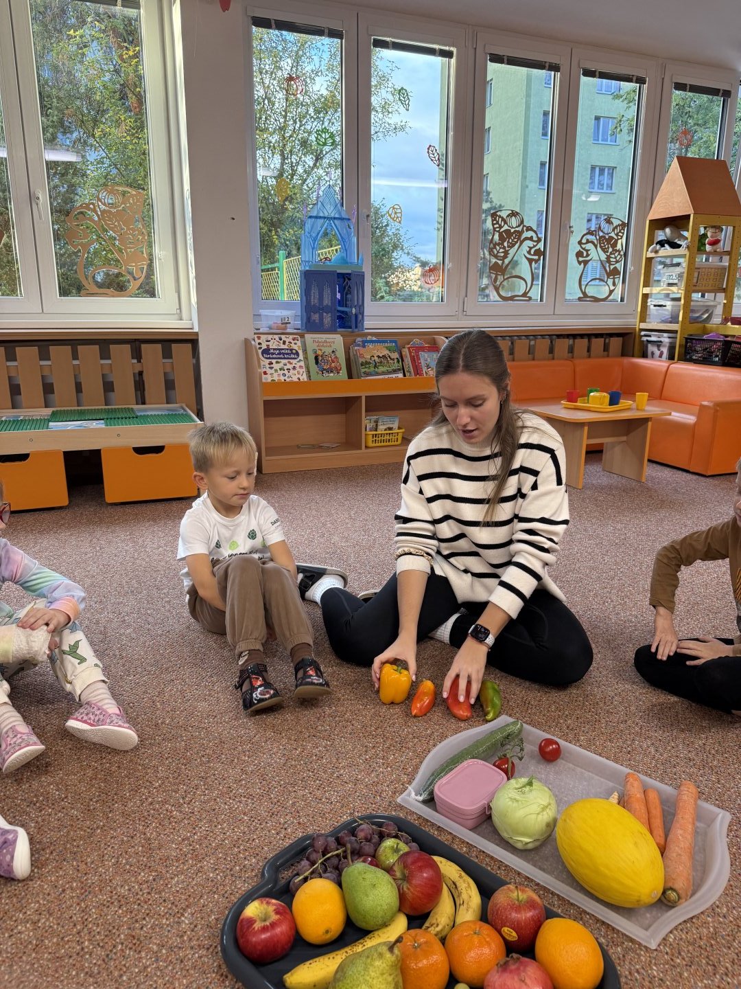 Dnes jsme si s dětmi užili barevné dopoledne plné chutí a vůní! Společně jsme poznávali různé druhy ovoce a zeleniny, zkoumali jsme, jak vypadají, jak voní a jak chutnají. Děti třídily jednotlivé druhy podle barvy, tvaru i podle toho, zda jde o ovoce nebo zeleninu. Děti poznávaly hlavně pomocí smyslu, pomocí škrabošky museli uhádnout co mají v puse (pokud děti škrabošku nechtěly, nenutili jsme a pouze zavřely oči).