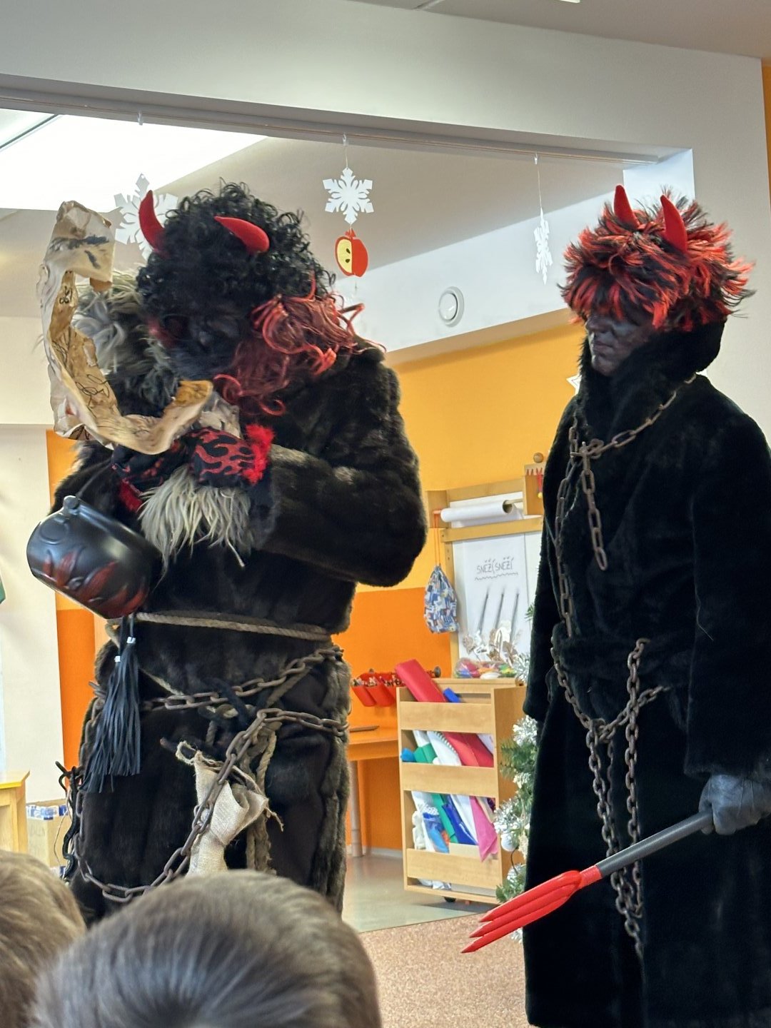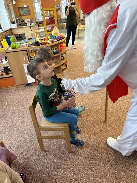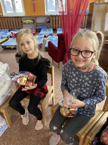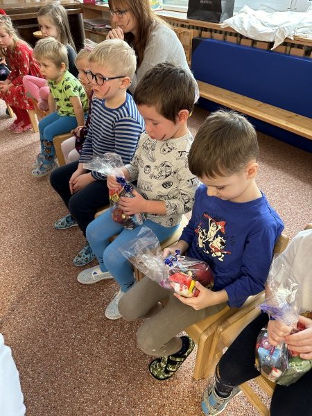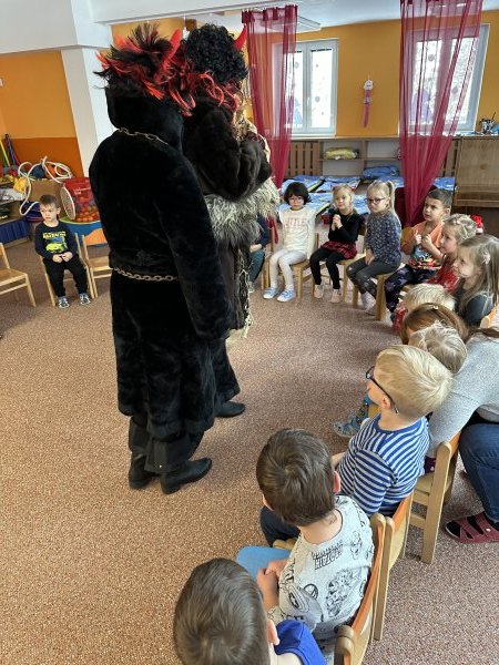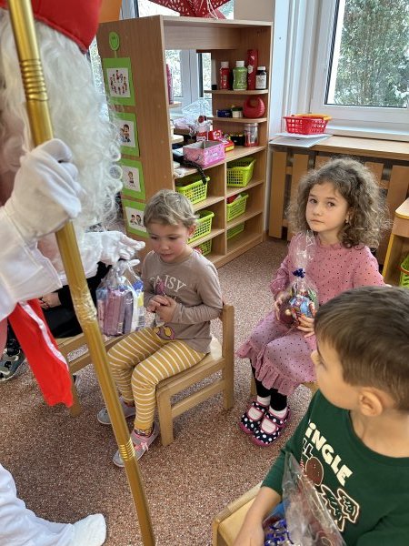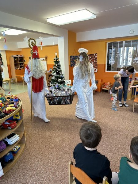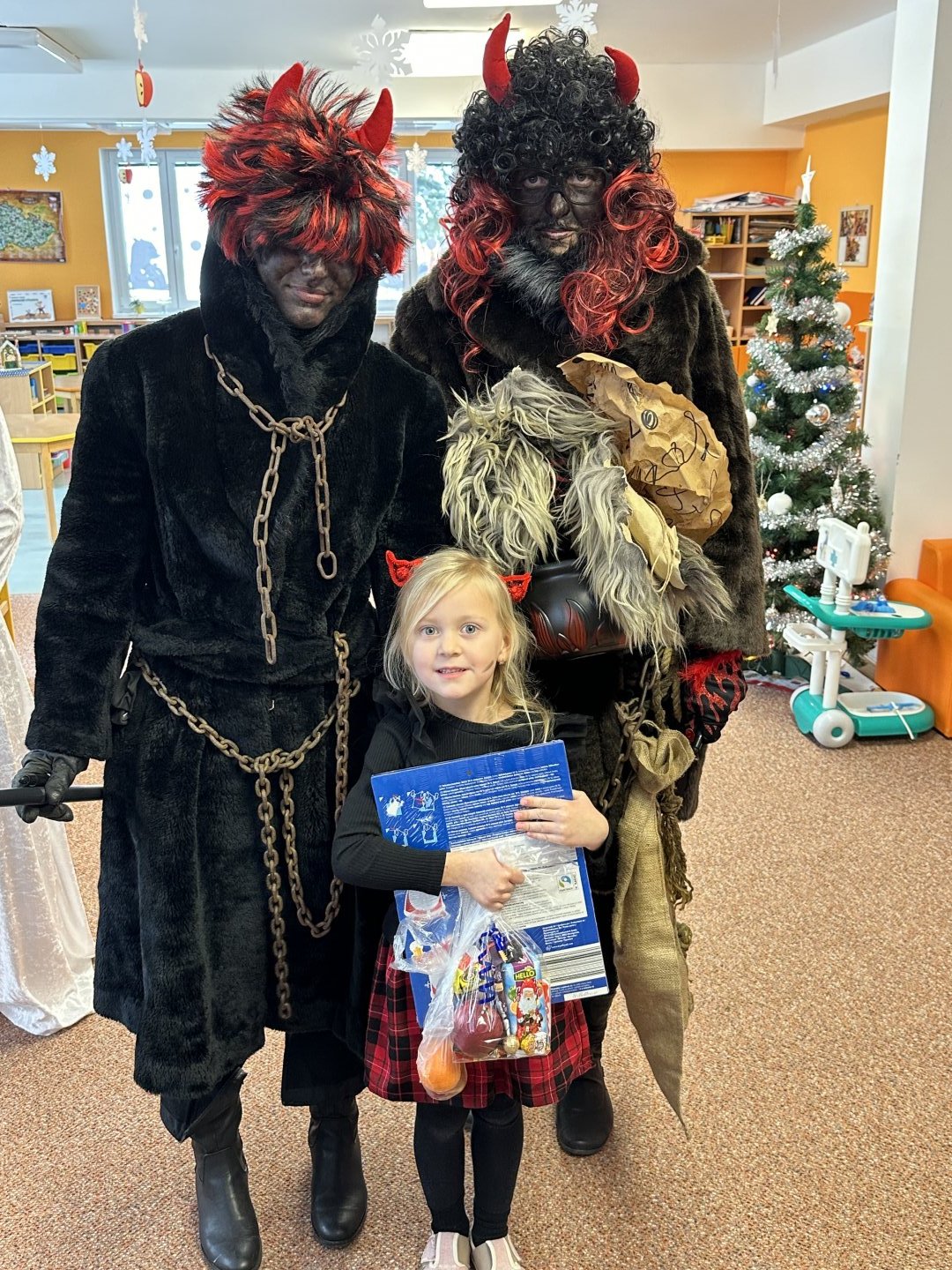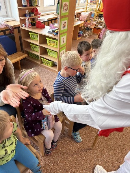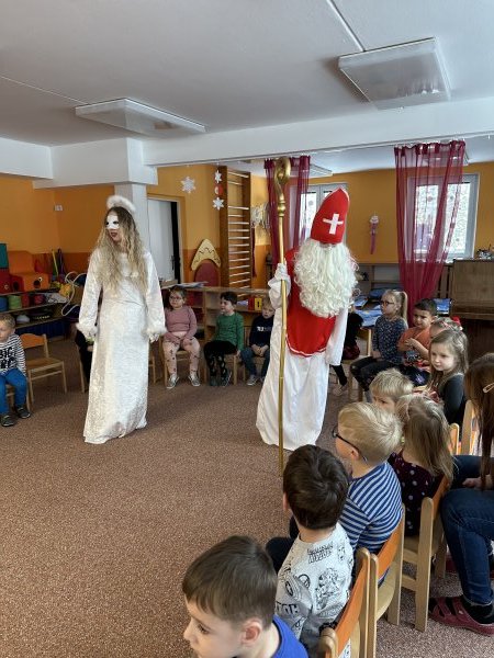 Minulý týden jsme měli ve školce vzácnou návštěvu. Přišel se na nás podívat Mikuláš s andělem. Samozřejmě nechyběli ani dva čertíci, kteří po celodenním řádění ve školce dostali pořádný hlad. Mikuláš dětem rozdal spoustu sladkostí za statečnost a děti mu pro radost zazpívaly písničku.