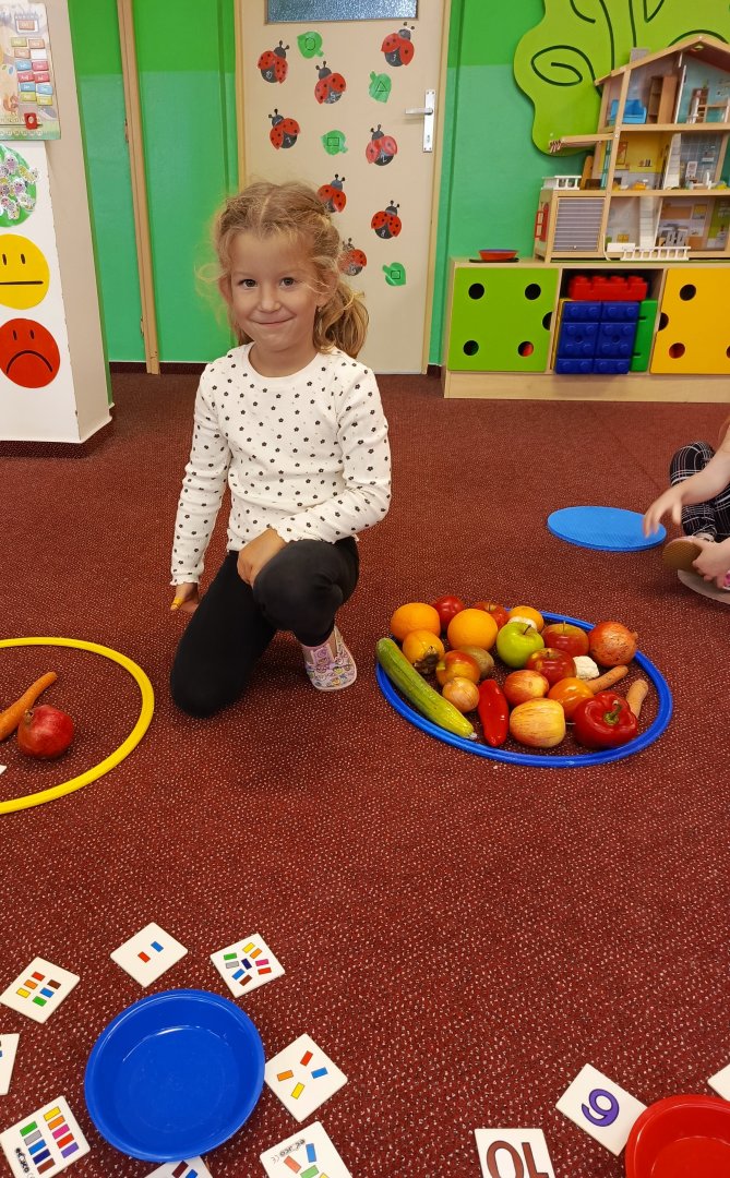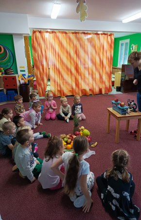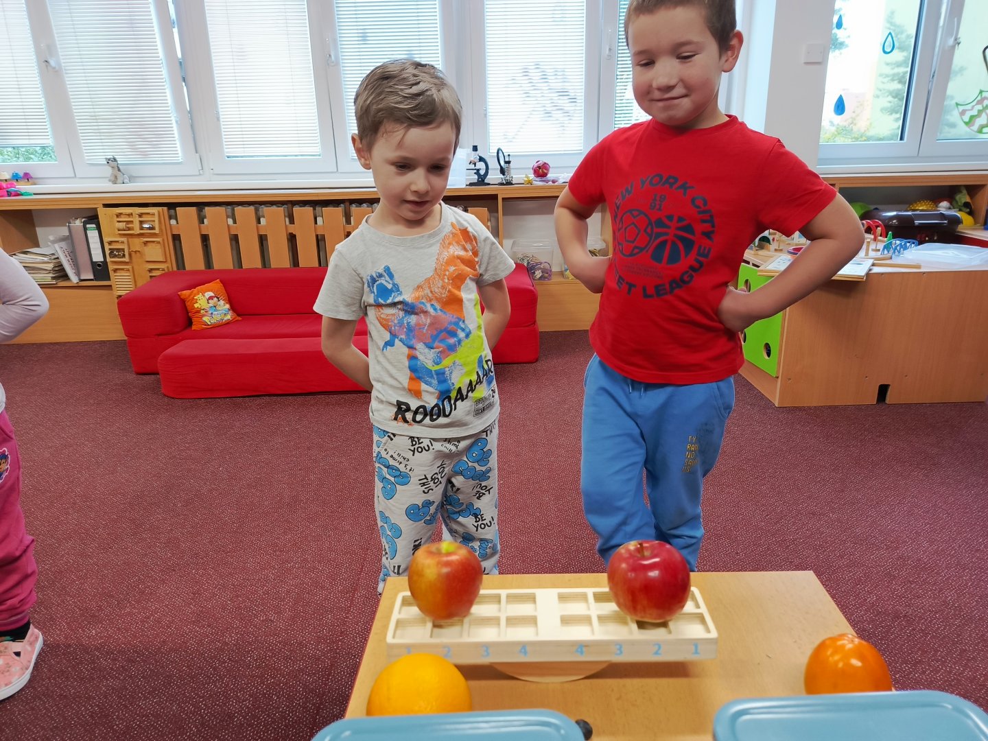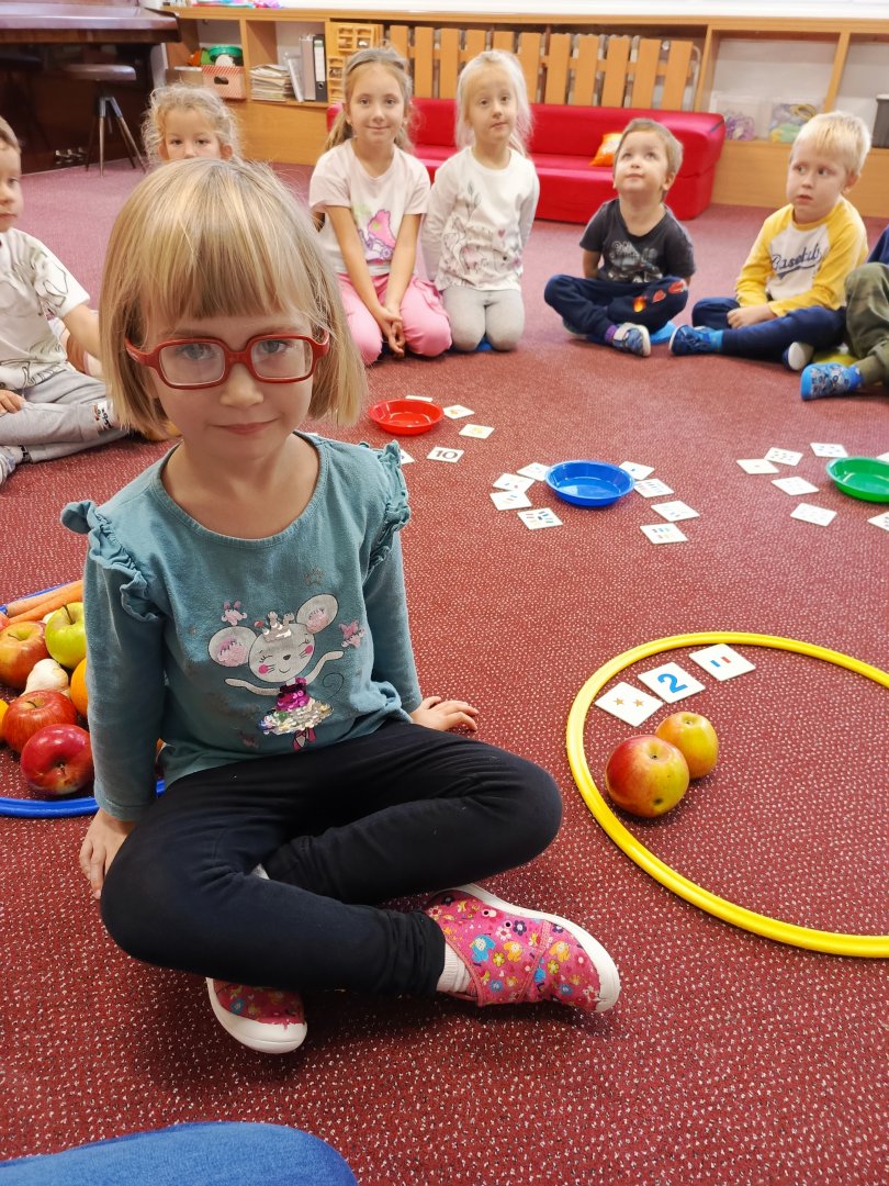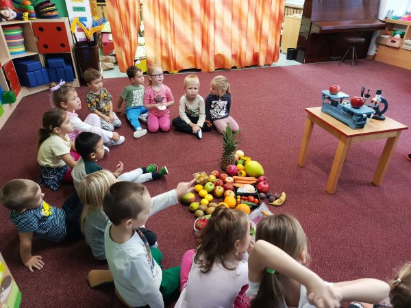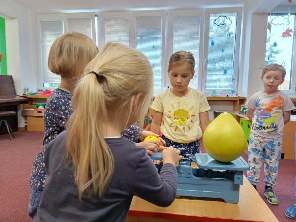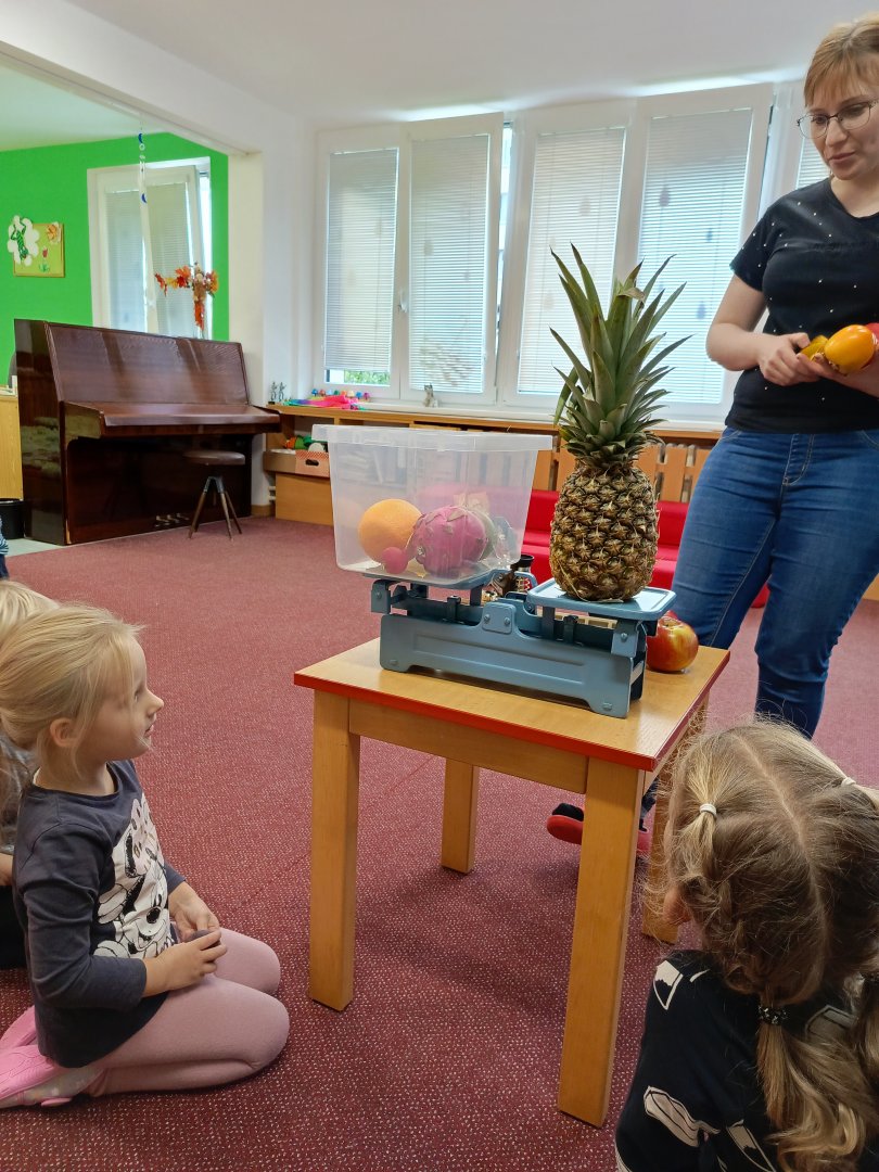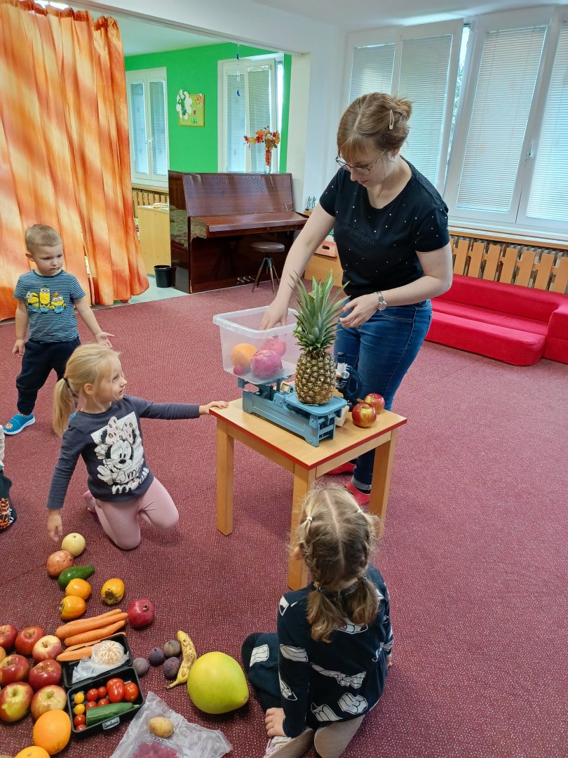 Tento týden jsme se věnovali ovoci a zelenině. Děti se seznámily s různou zeleninou a ovocem i exotickým. Poznaly, že každé ovoce i zelenina má jiný tvar, vůni, chuť, je jinak těžké. Vyzkoušely si vše zvážit a vytvořit na váze rovnováhu. Také ovoce a zeleninu počítaly, pozorovaly pod lupou a mikroskopem. V pokusu, co plave a neplave, se dozvěděly, že kiwi a mrkev v obyčejné vodě neplavou, ale ve slané vodě plavou. V logopedické třídě plnily úkoly na kouzelné tabuli k tomuto tématu. Také jsme sbírali kaštany, oslavili narozeniny a svátek, ve školce proběhlo divadlo s pohádkou o podzimu.
