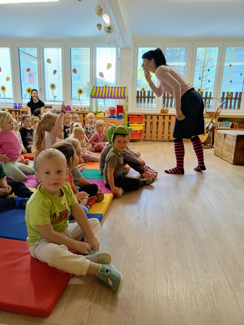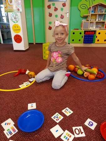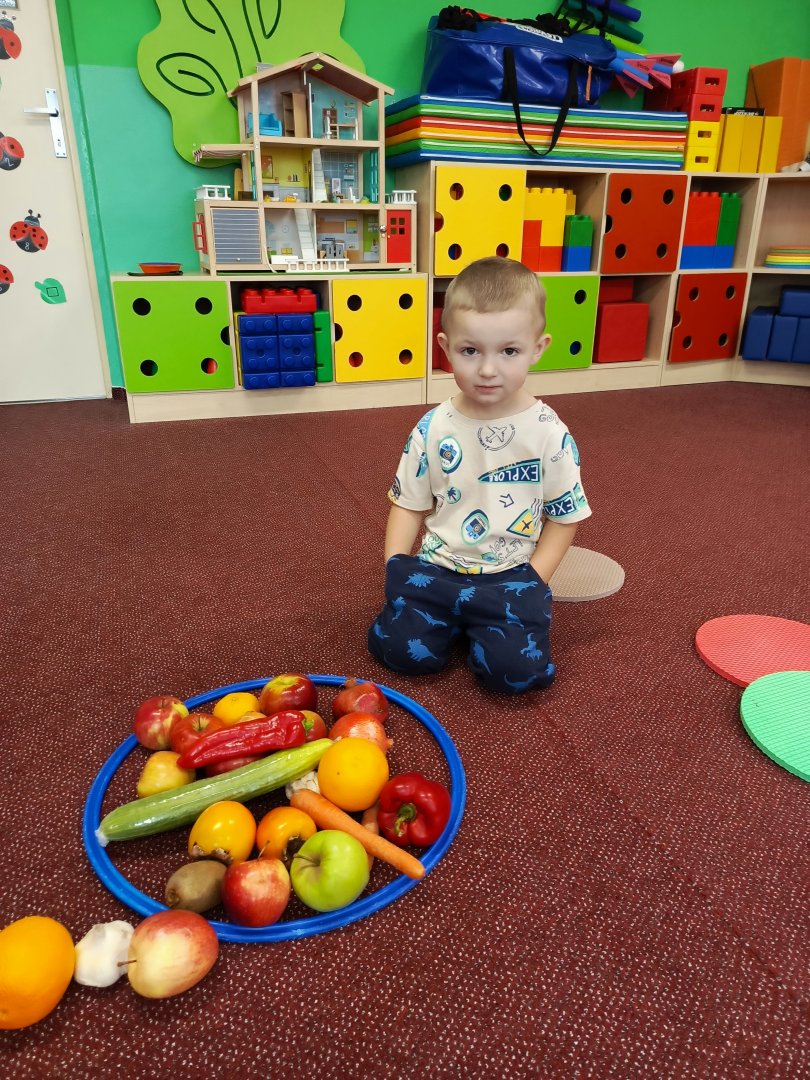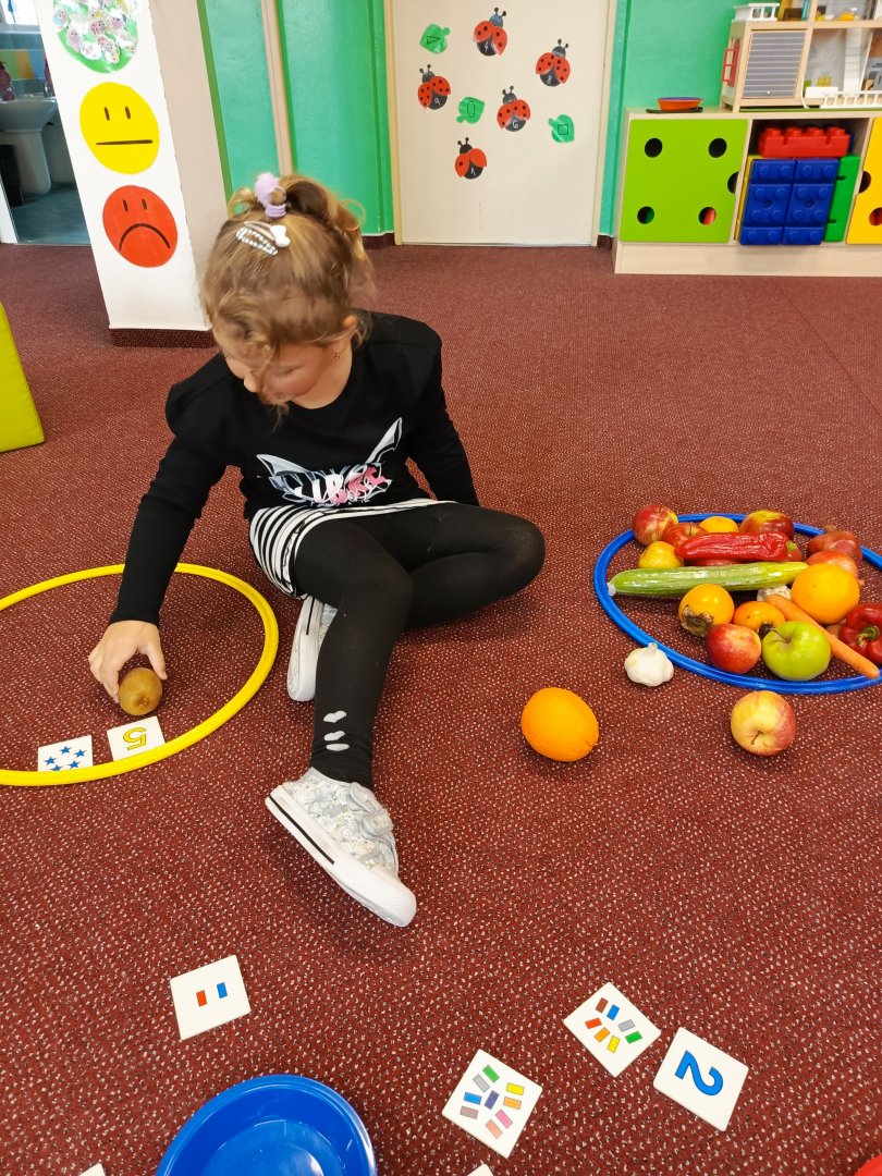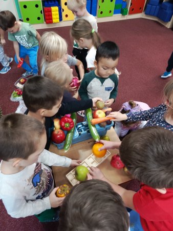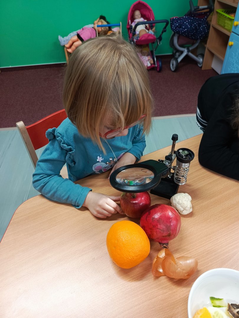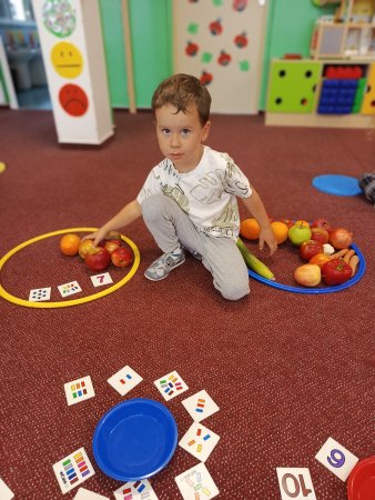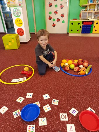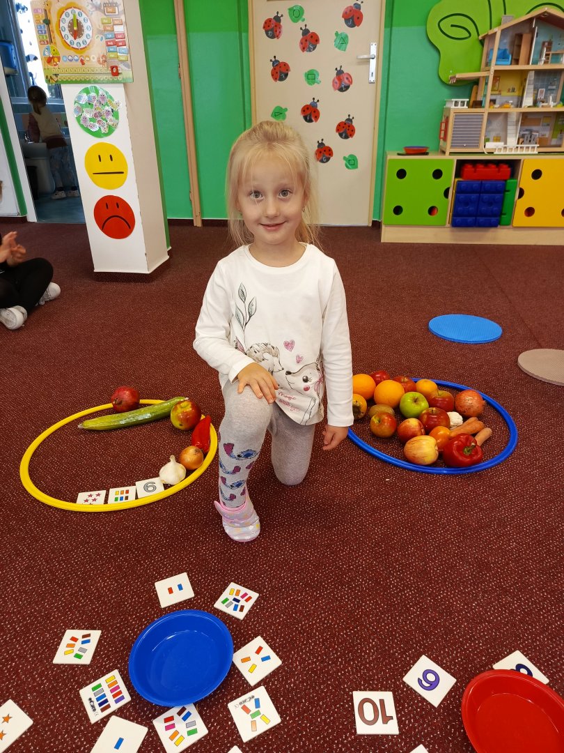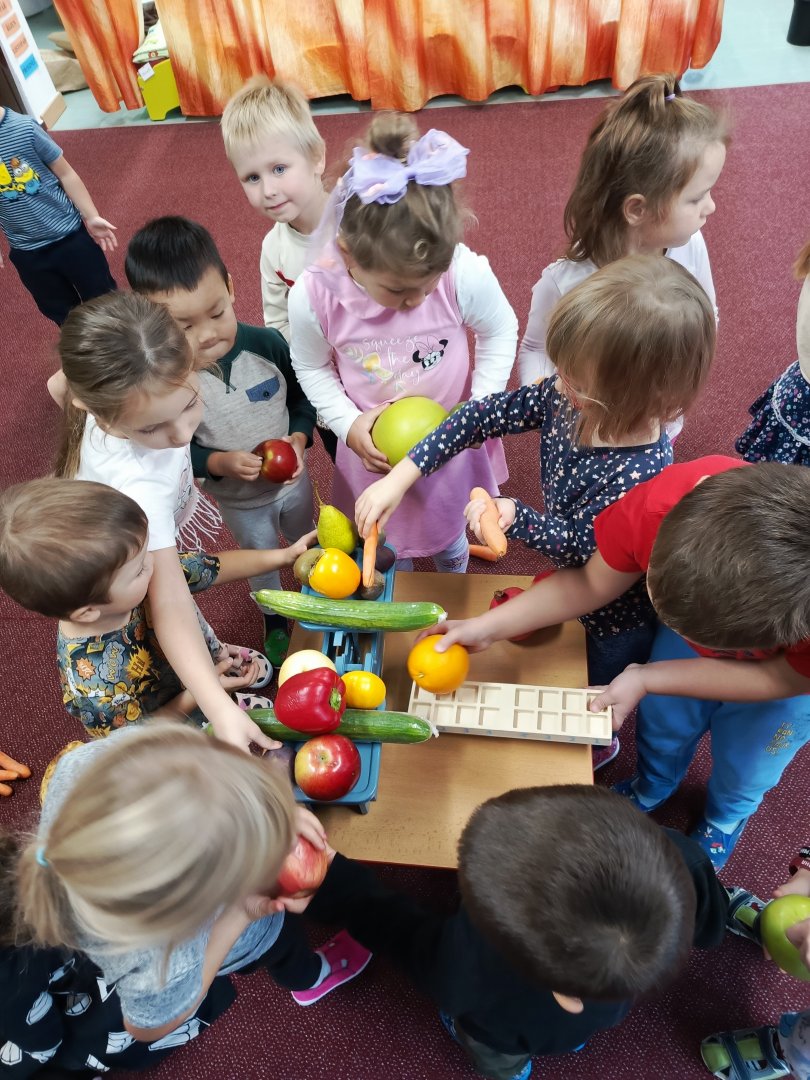 Tento týden jsme se věnovali ovoci a zelenině. Děti se seznámily s různou zeleninou a ovocem i exotickým. Poznaly, že každé ovoce i zelenina má jiný tvar, vůni, chuť, je jinak těžké. Vyzkoušely si vše zvážit a vytvořit na váze rovnováhu. Také ovoce a zeleninu počítaly, pozorovaly pod lupou a mikroskopem. V pokusu, co plave a neplave, se dozvěděly, že kiwi a mrkev v obyčejné vodě neplavou, ale ve slané vodě plavou. V logopedické třídě plnily úkoly na kouzelné tabuli k tomuto tématu. Také jsme sbírali kaštany, oslavili narozeniny a svátek, ve školce proběhlo divadlo s pohádkou o podzimu.