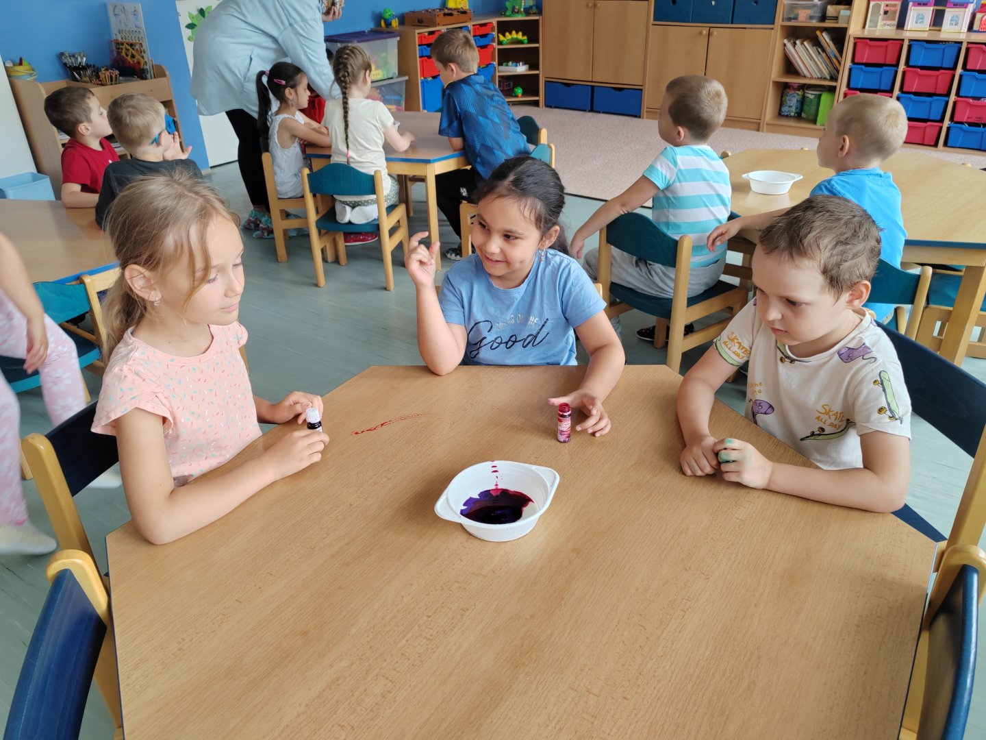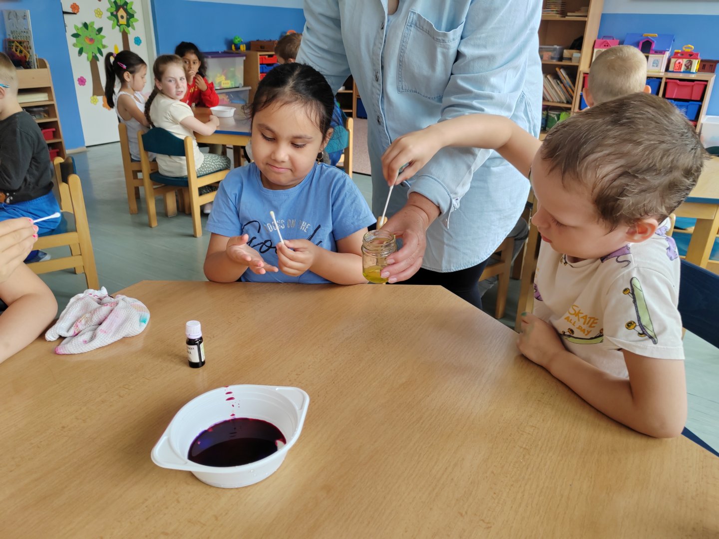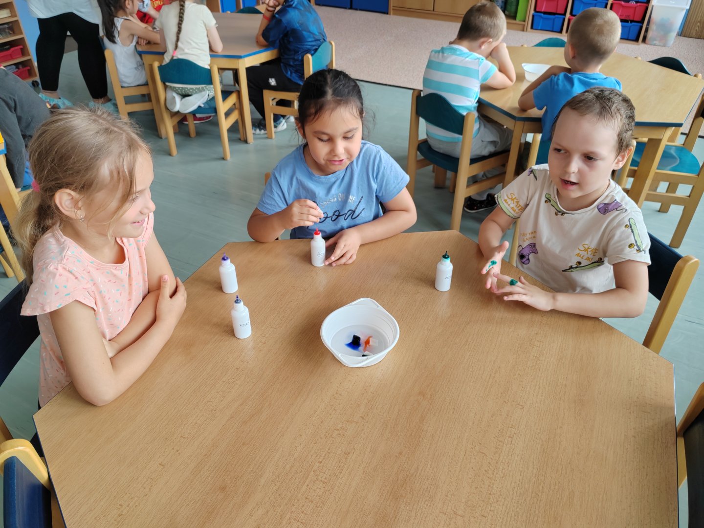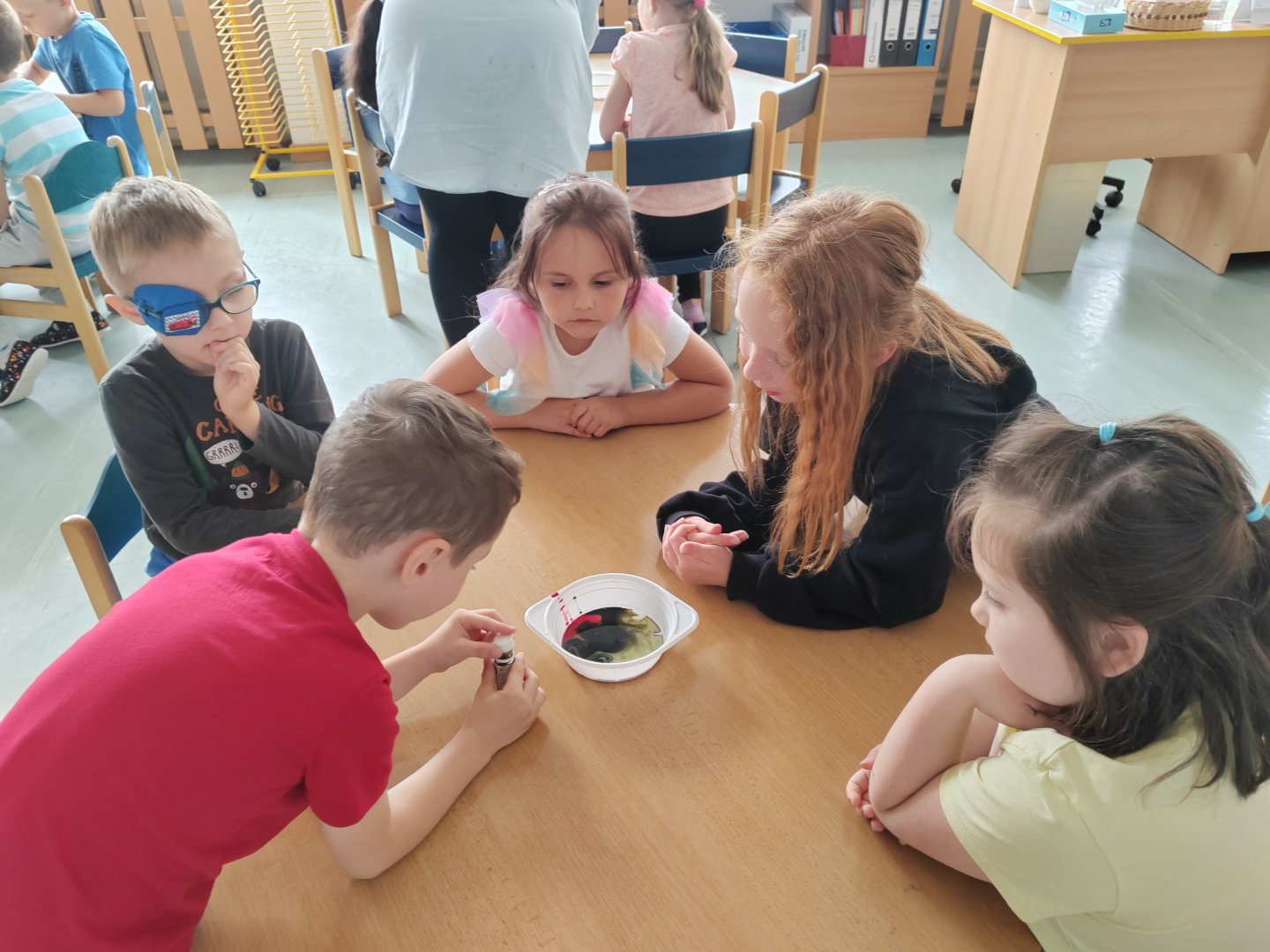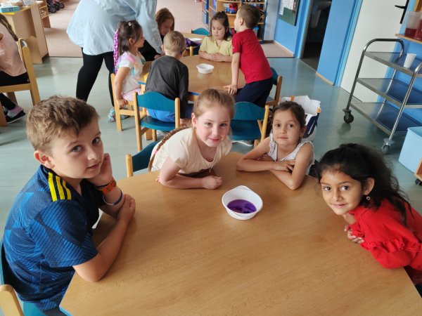 V úterý 4.6.2024 předškolní děti zažily interaktivní dopoledne s paní lektorkou Alenou Novákovou. Cílem bylo poznat a vyzkoušet co všechno barvičky s různými přísadami dovedou. Dětem se pokusy moc líbily a odnesly si tak nevšední zážitky.
