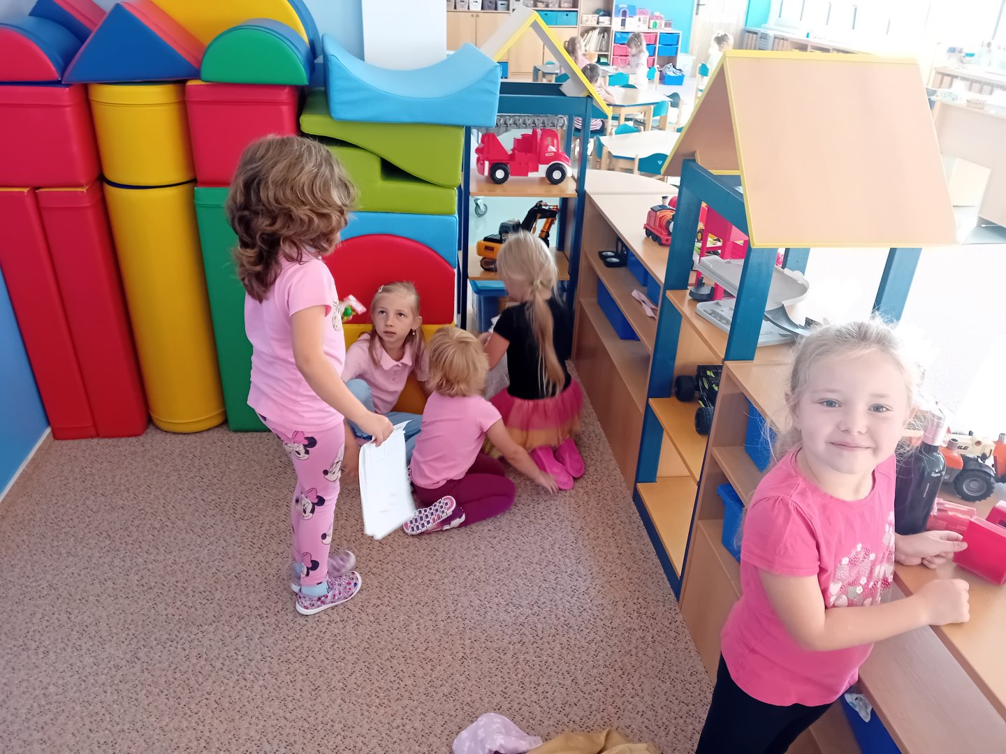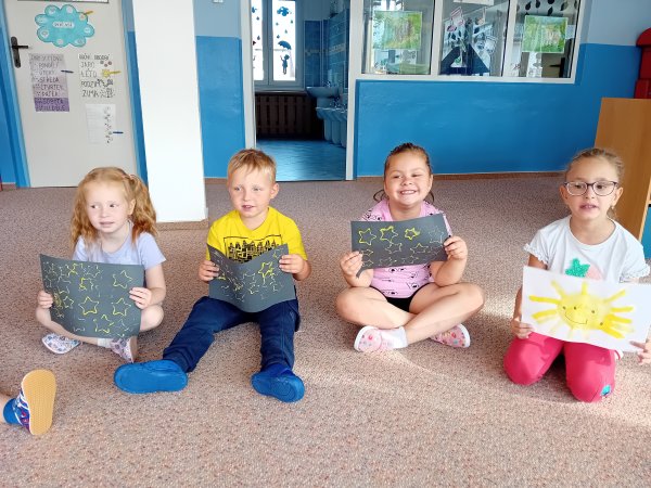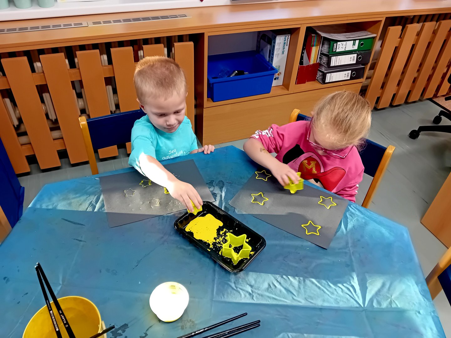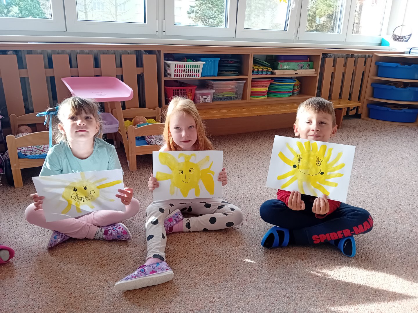 Od začátku školního roku se děti seznamují s prostředím třídy, se svými kamarády, s jejich jmény a také se věnují týdenním tématům. V tomto týdnu je to téma "Jak správně běží den za dnem", kdy se děti učí chápat elementární časové pojmy - dnes, včera, zítra, ráno, večer apod. Děti si vyrobily slunce a hvězdy. Slunce malovaly štětcem a temperou a hvězdy tiskaly pomocí vykrajovátek. Také se naučily báseň "V noci", zpívají písně s doprovodem piana, hrají pohybové hry. Při vycházkách poznávají okolí mateřské školy, učí se chodit ve dvojicích a také jak bezpečně přecházet přes silnici.