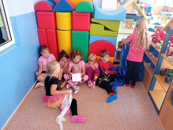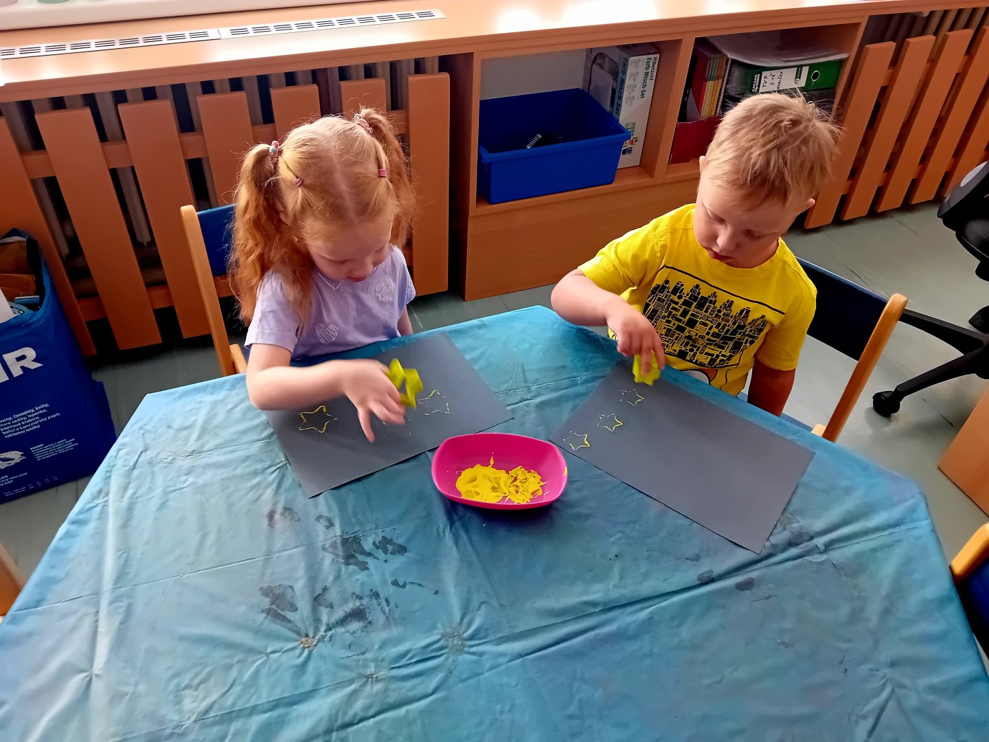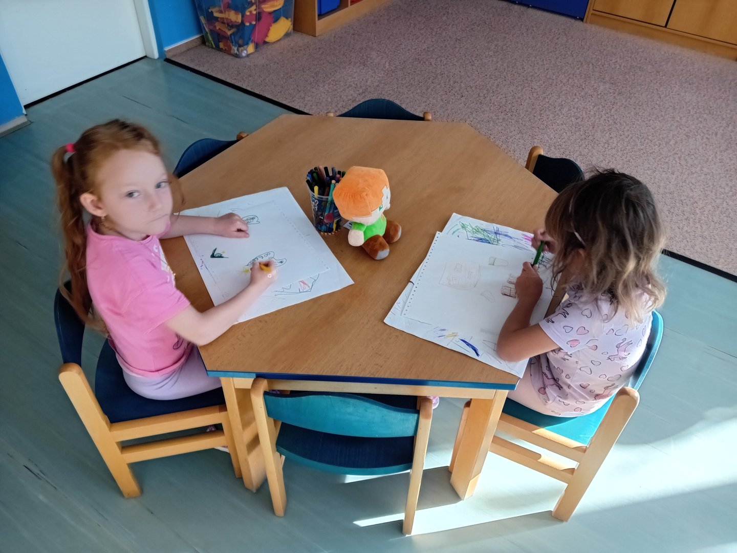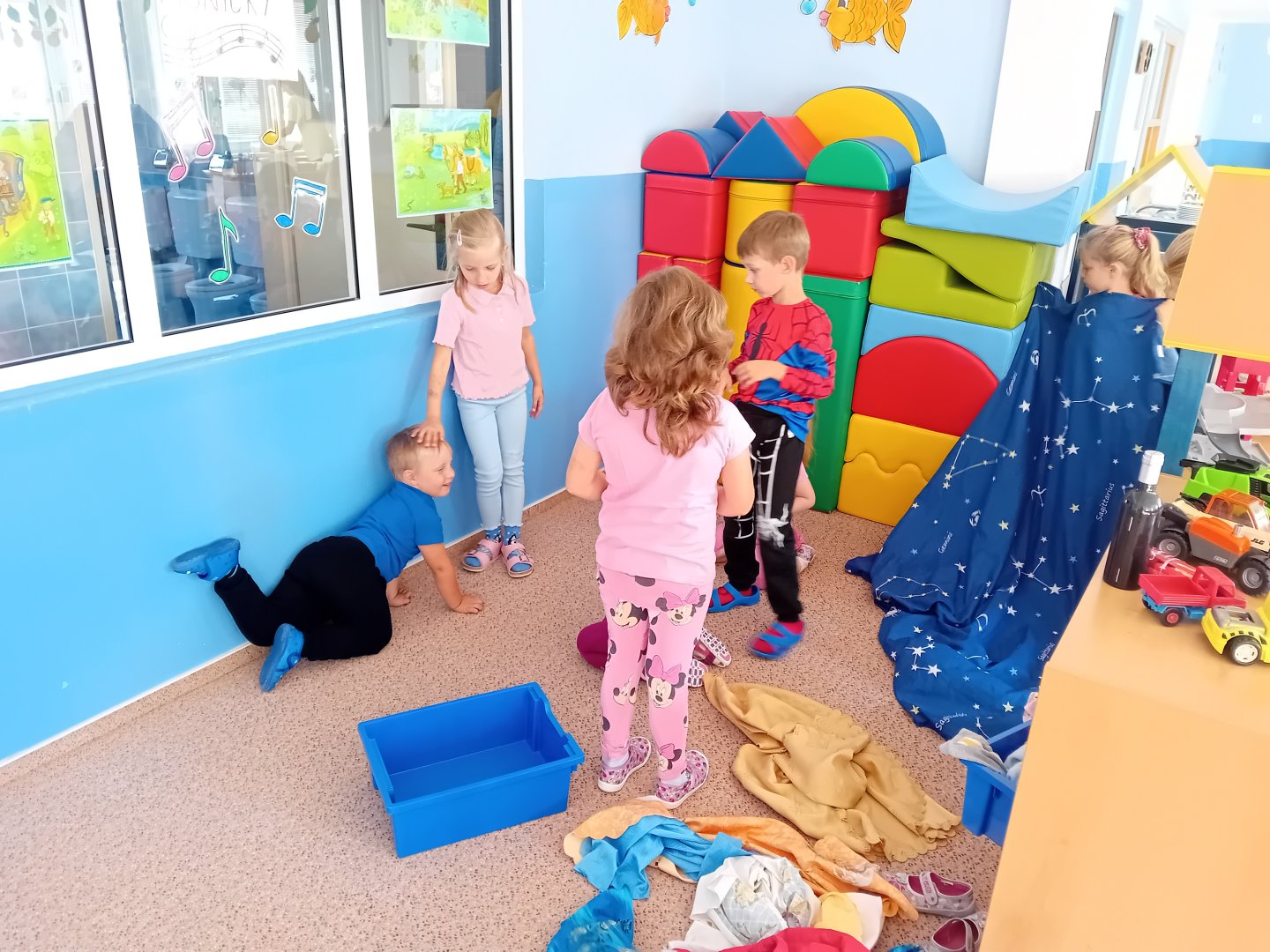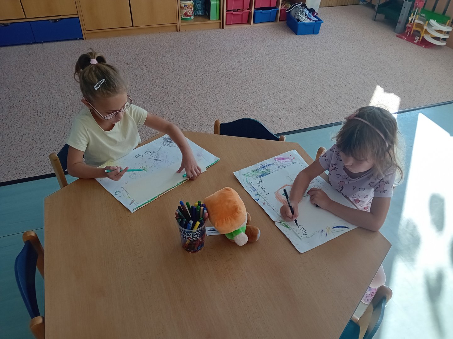 Od začátku školního roku se děti seznamují s prostředím třídy, se svými kamarády, s jejich jmény a také se věnují týdenním tématům. V tomto týdnu je to téma "Jak správně běží den za dnem", kdy se děti učí chápat elementární časové pojmy - dnes, včera, zítra, ráno, večer apod. Děti si vyrobily slunce a hvězdy. Slunce malovaly štětcem a temperou a hvězdy tiskaly pomocí vykrajovátek. Také se naučily báseň "V noci", zpívají písně s doprovodem piana, hrají pohybové hry. Při vycházkách poznávají okolí mateřské školy, učí se chodit ve dvojicích a také jak bezpečně přecházet přes silnici.