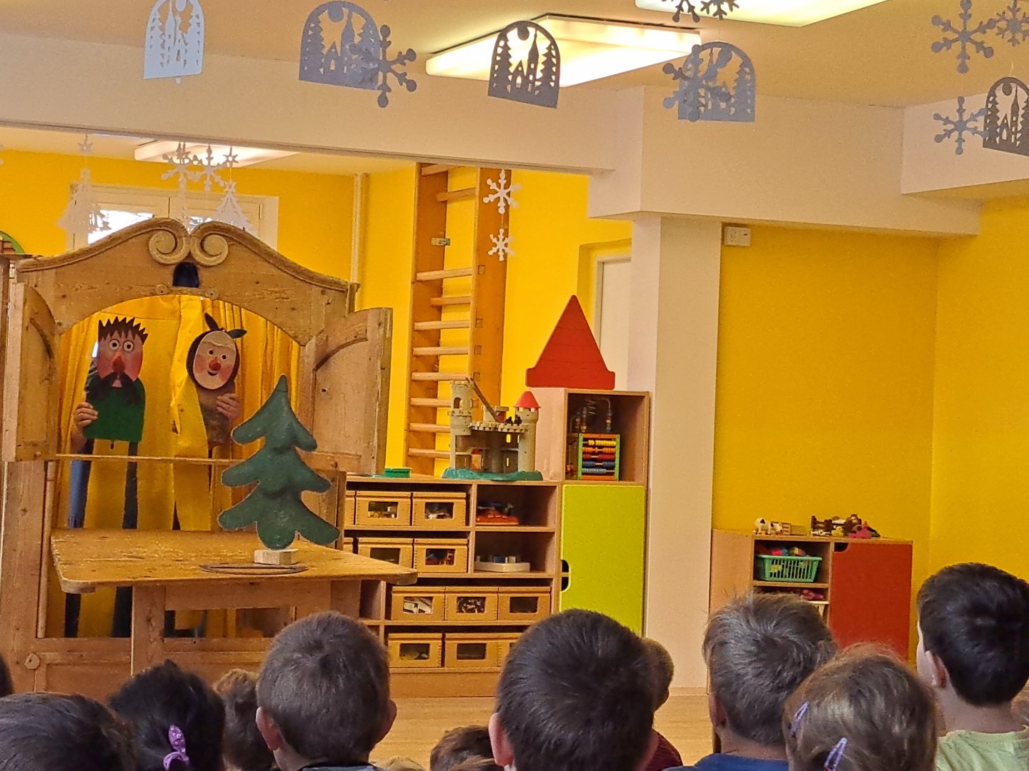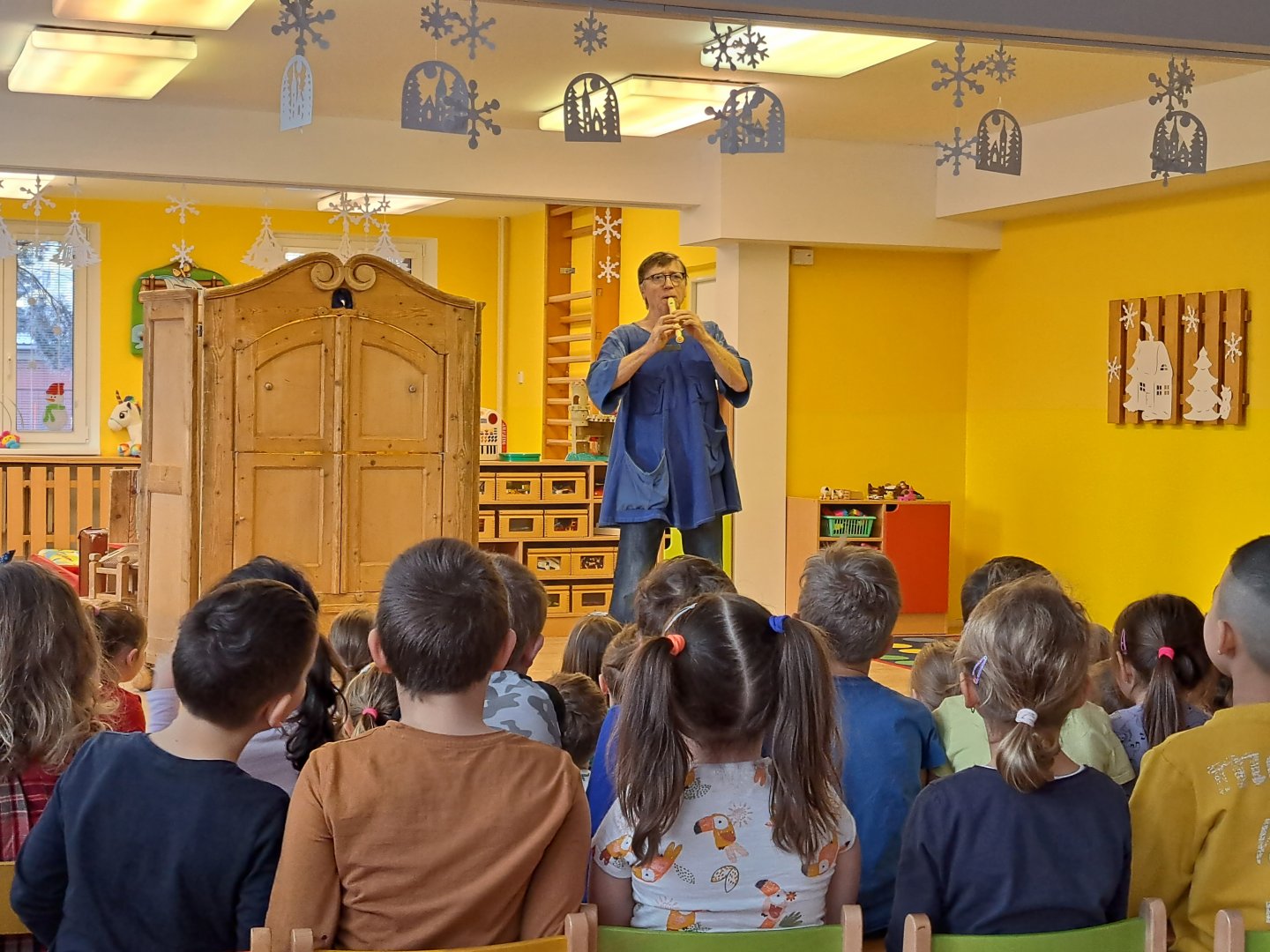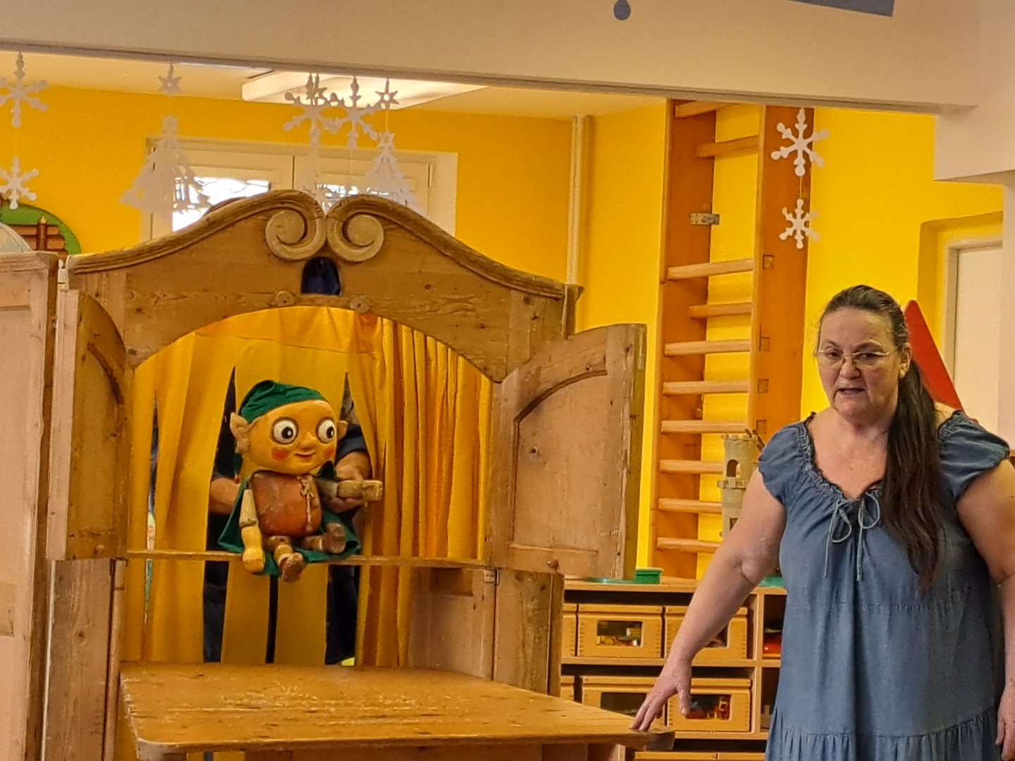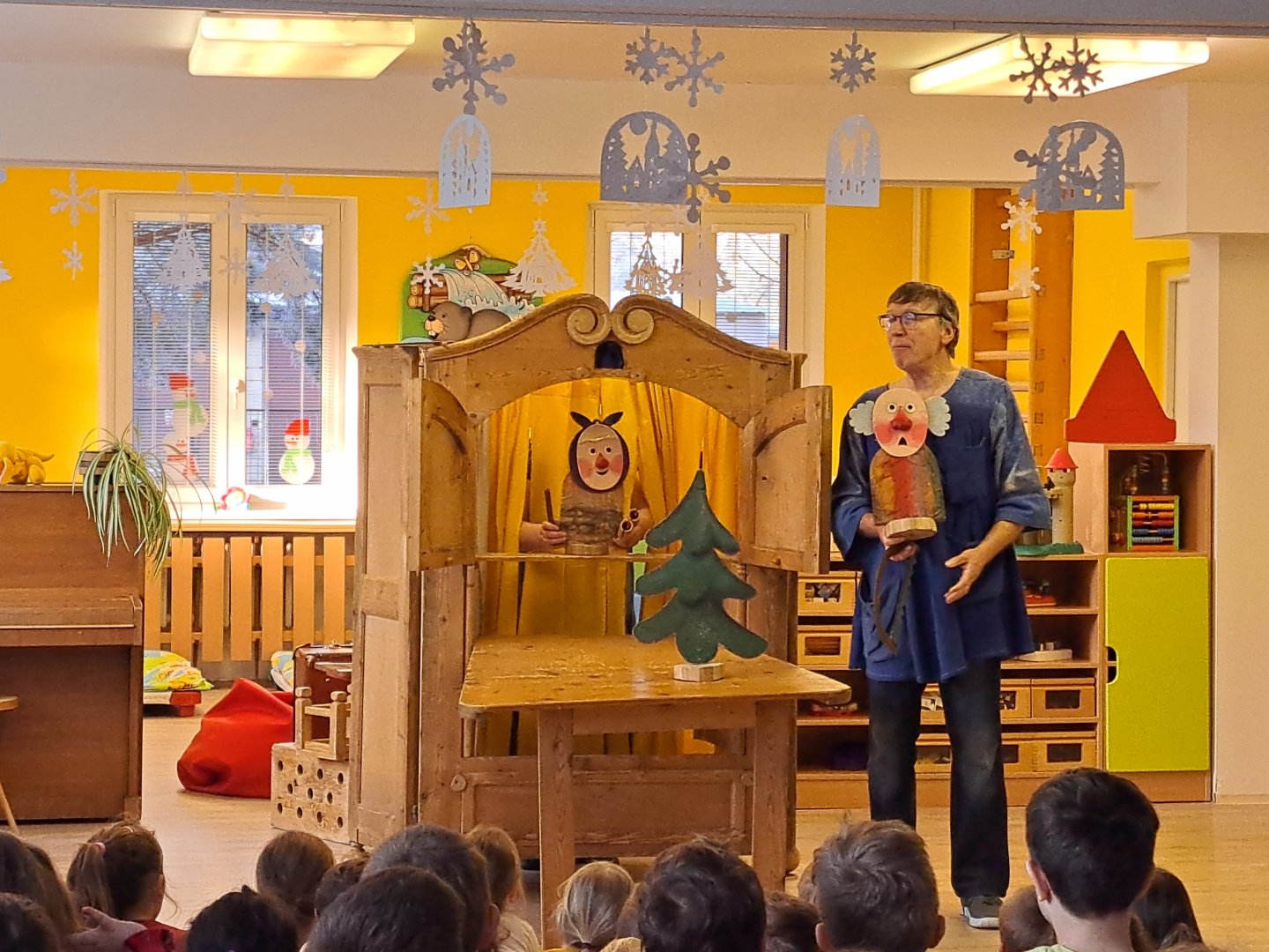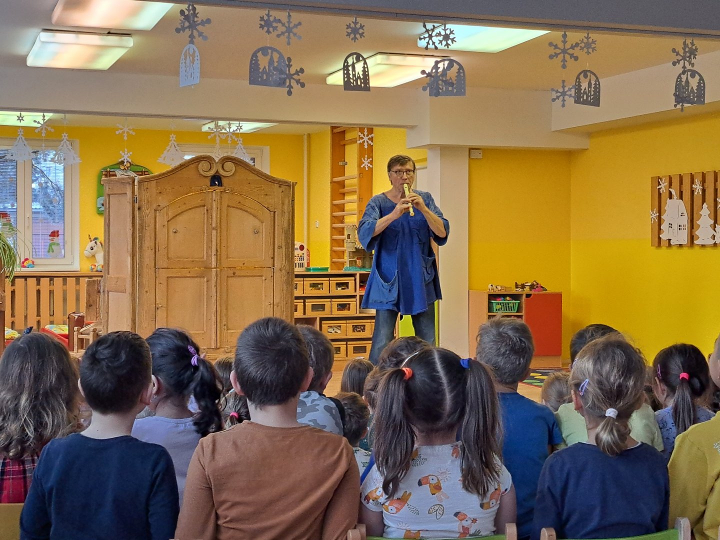 Divadlo ŠUS Rokycany zahrálo v mateřské škole pohádku o skřítku Skříňáčkovi, který se učil mluvit pomocí písní, básní a jazykolamů. Bylo to humorné představení, kde se děti staly jeho aktivními účastníky a pomohly skřítkovi ke správné výslovnosti.