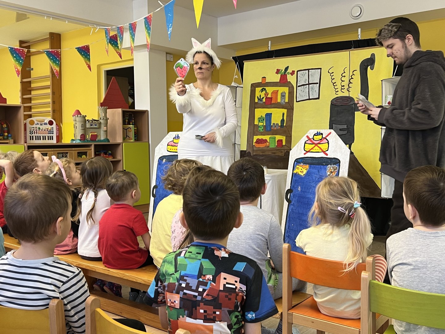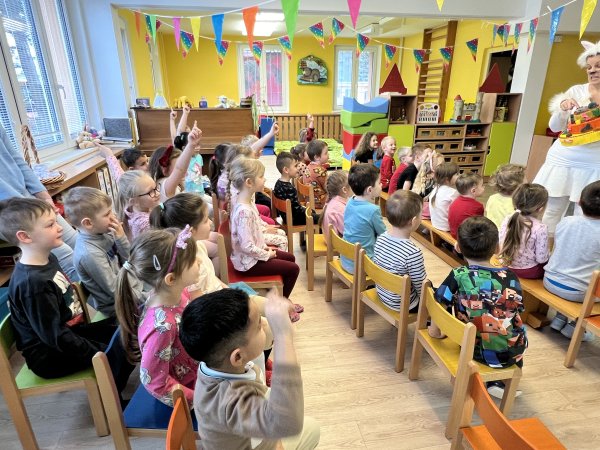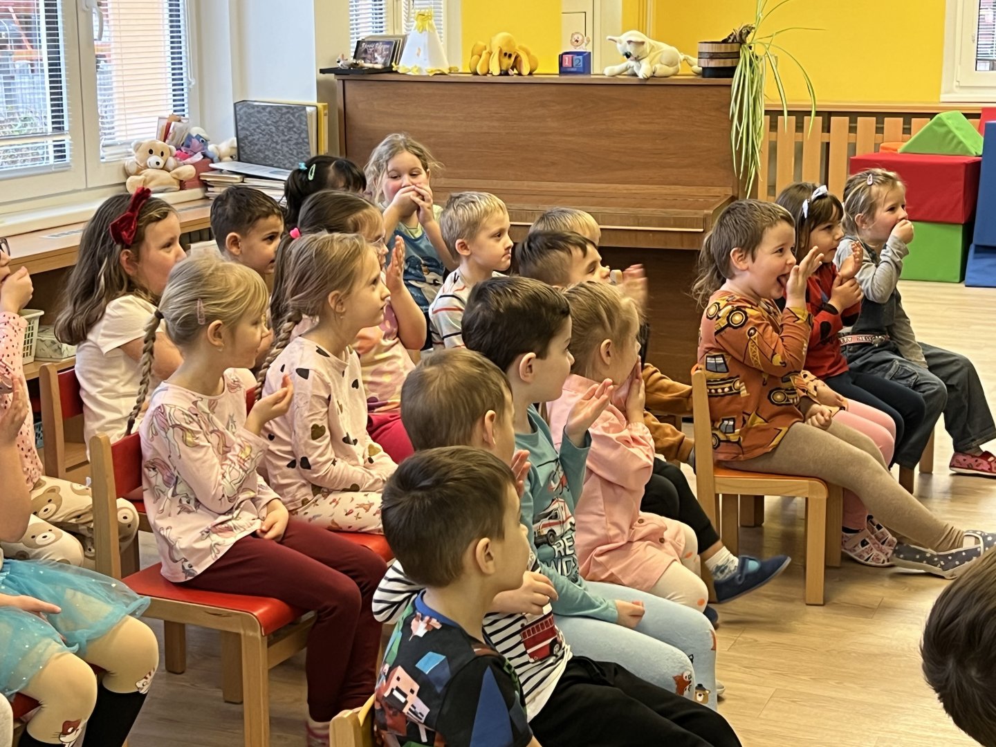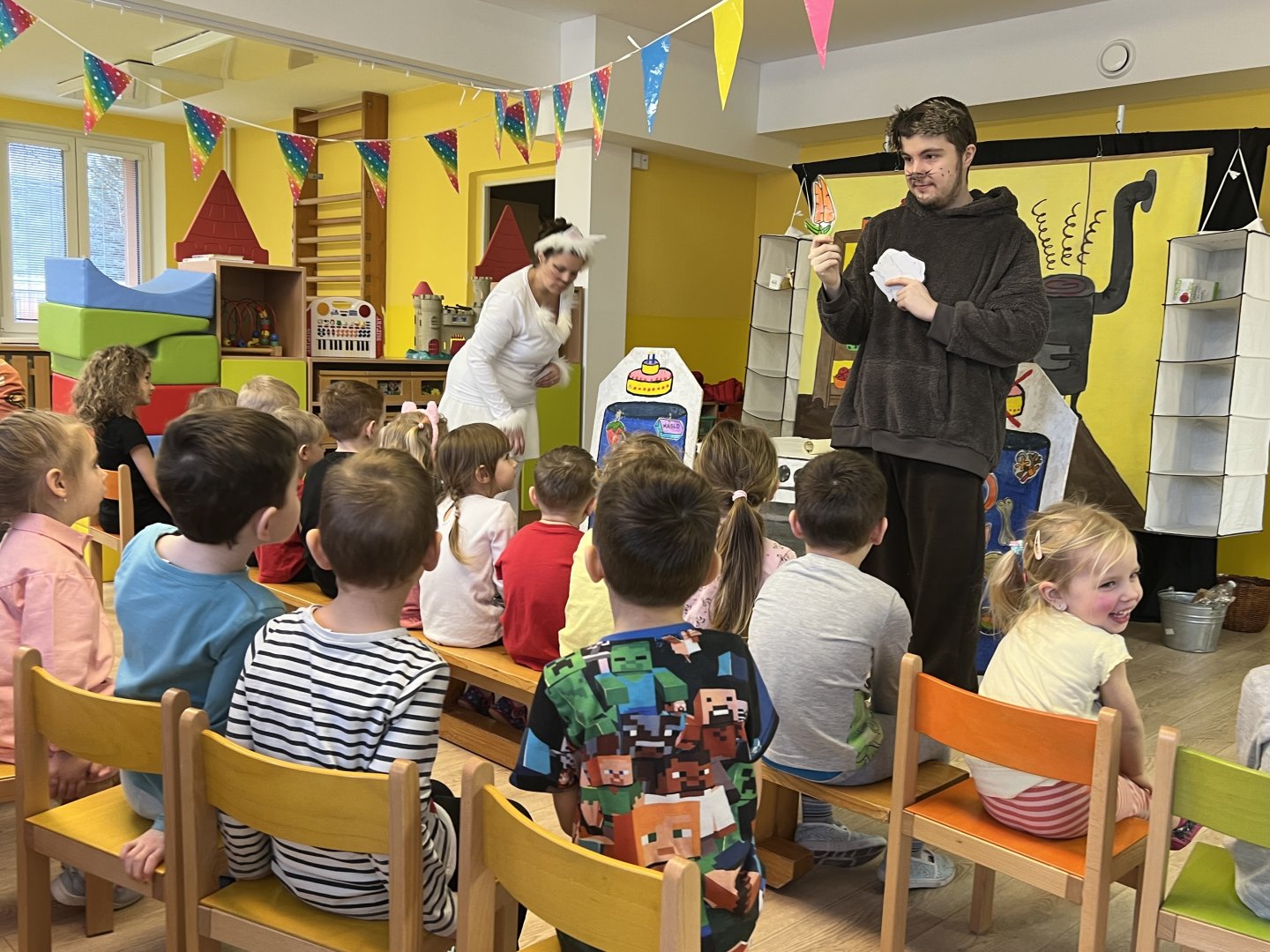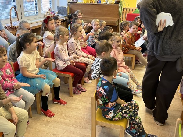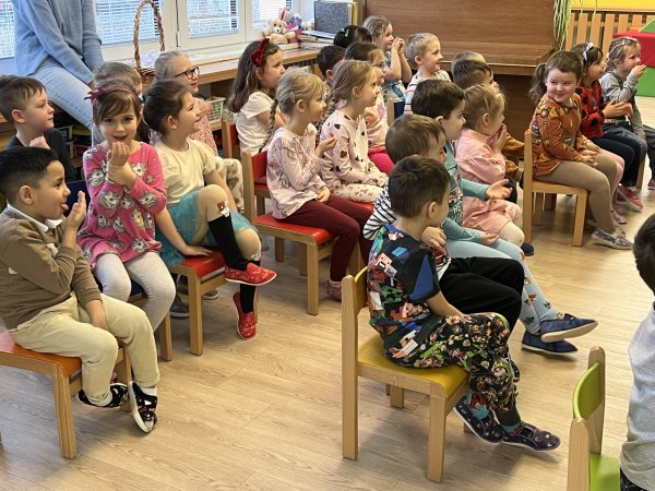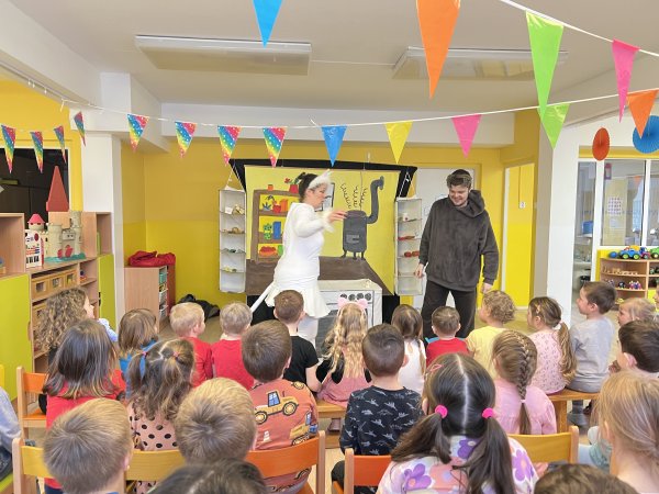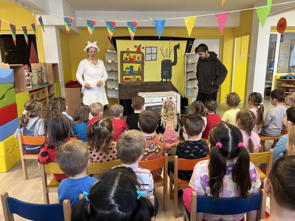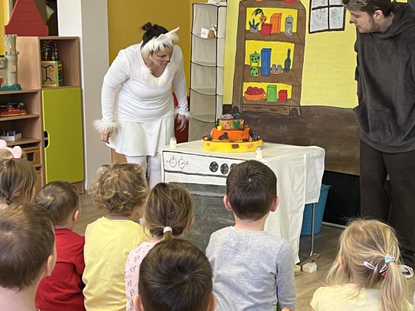 Dnes si děti vyzkoušely vzdělávací program s názvem Pejsek a kočička. Společně jsme umyli podlahu a uvřili dort. Během představení děti plnily různé úkoly a pomáhaly pejskovi a kočičce. Představení bylo krásné a děti se u trampot pejska a kočičky hodně nasmály.