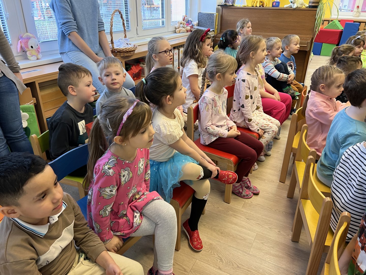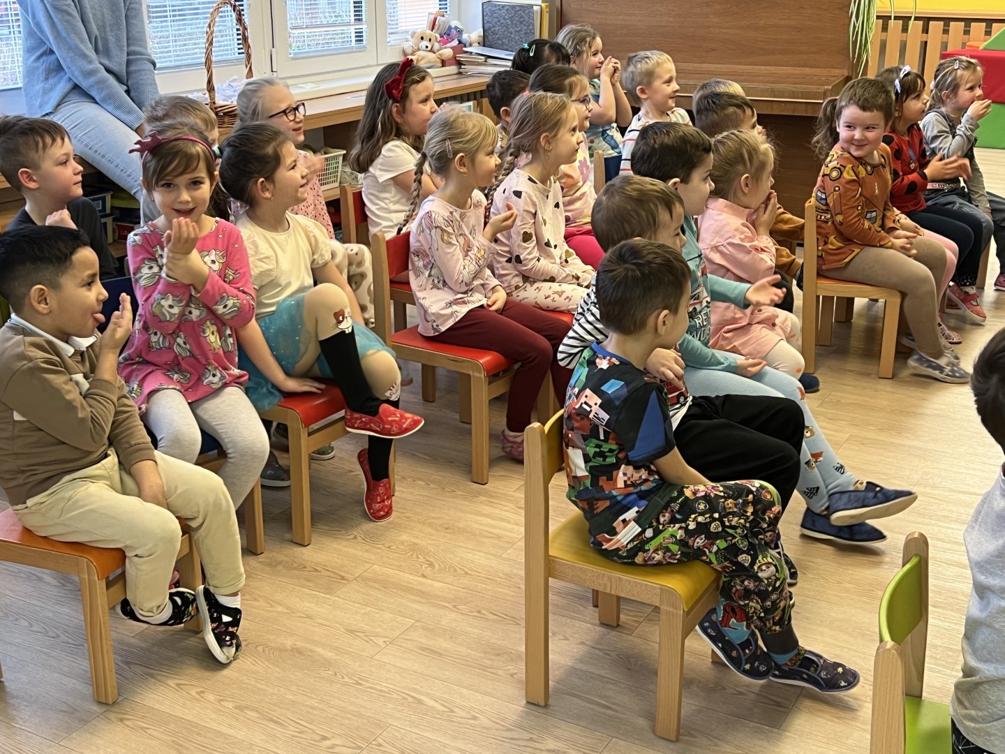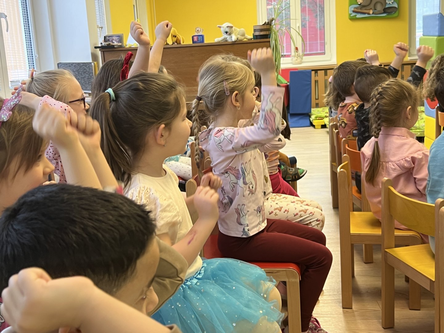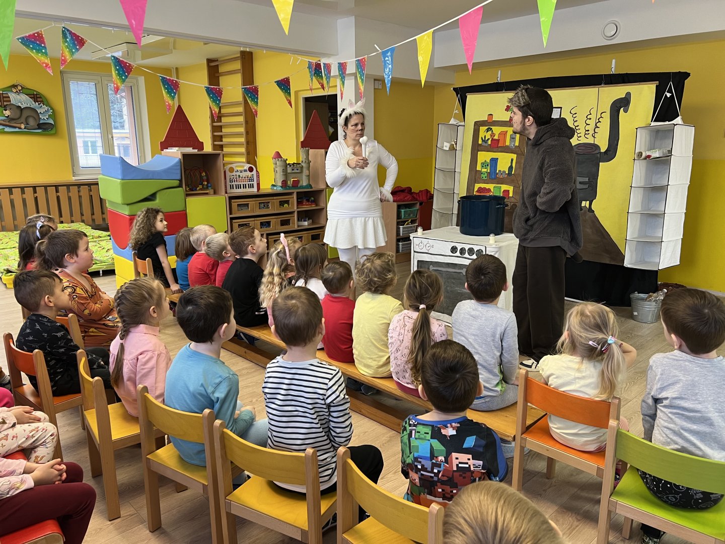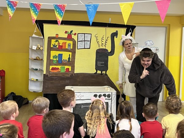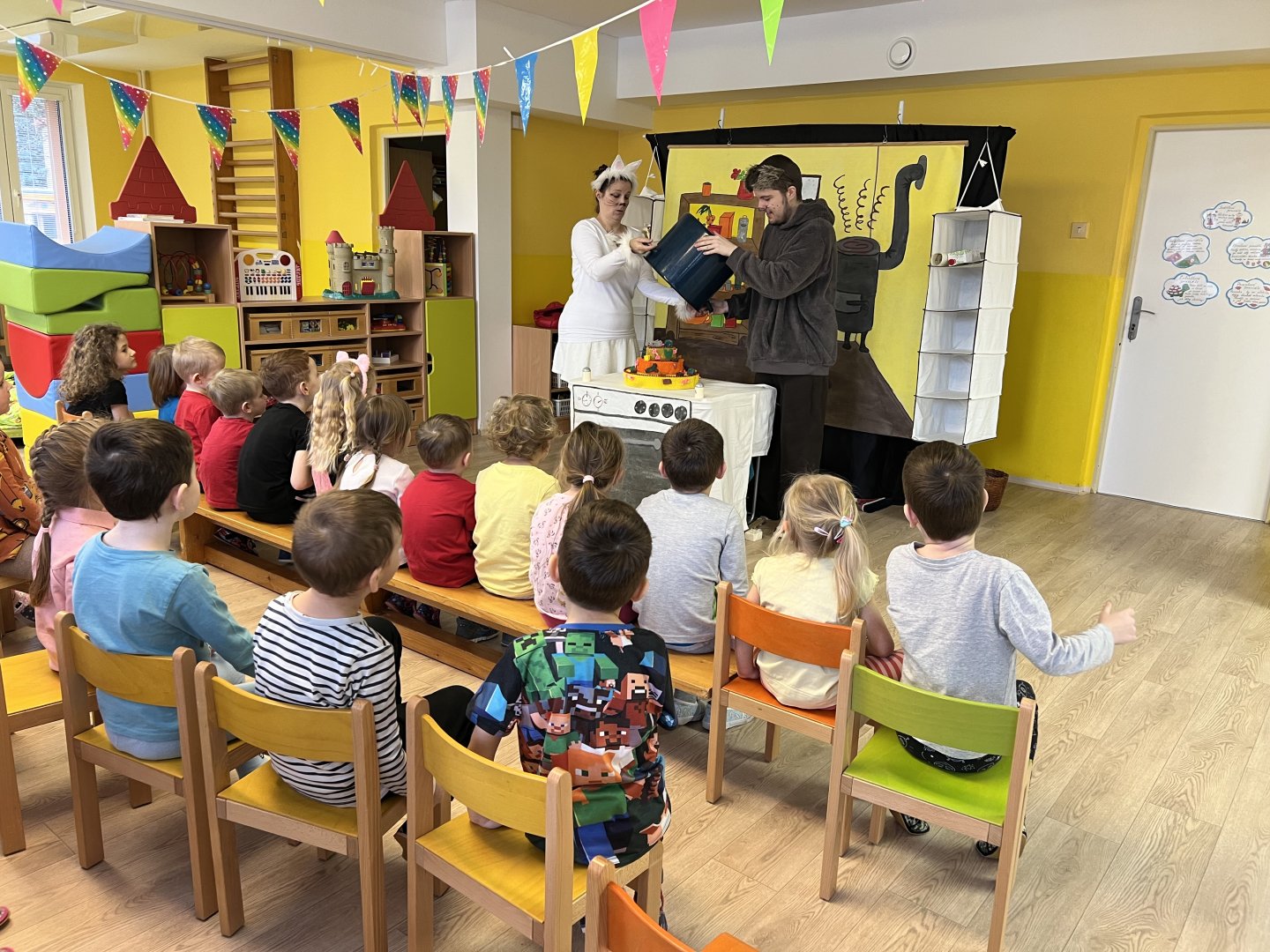 Dnes si děti vyzkoušely vzdělávací program s názvem Pejsek a kočička. Společně jsme umyli podlahu a uvřili dort. Během představení děti plnily různé úkoly a pomáhaly pejskovi a kočičce. Představení bylo krásné a děti se u trampot pejska a kočičky hodně nasmály.