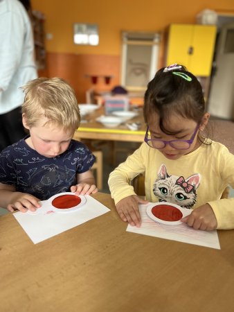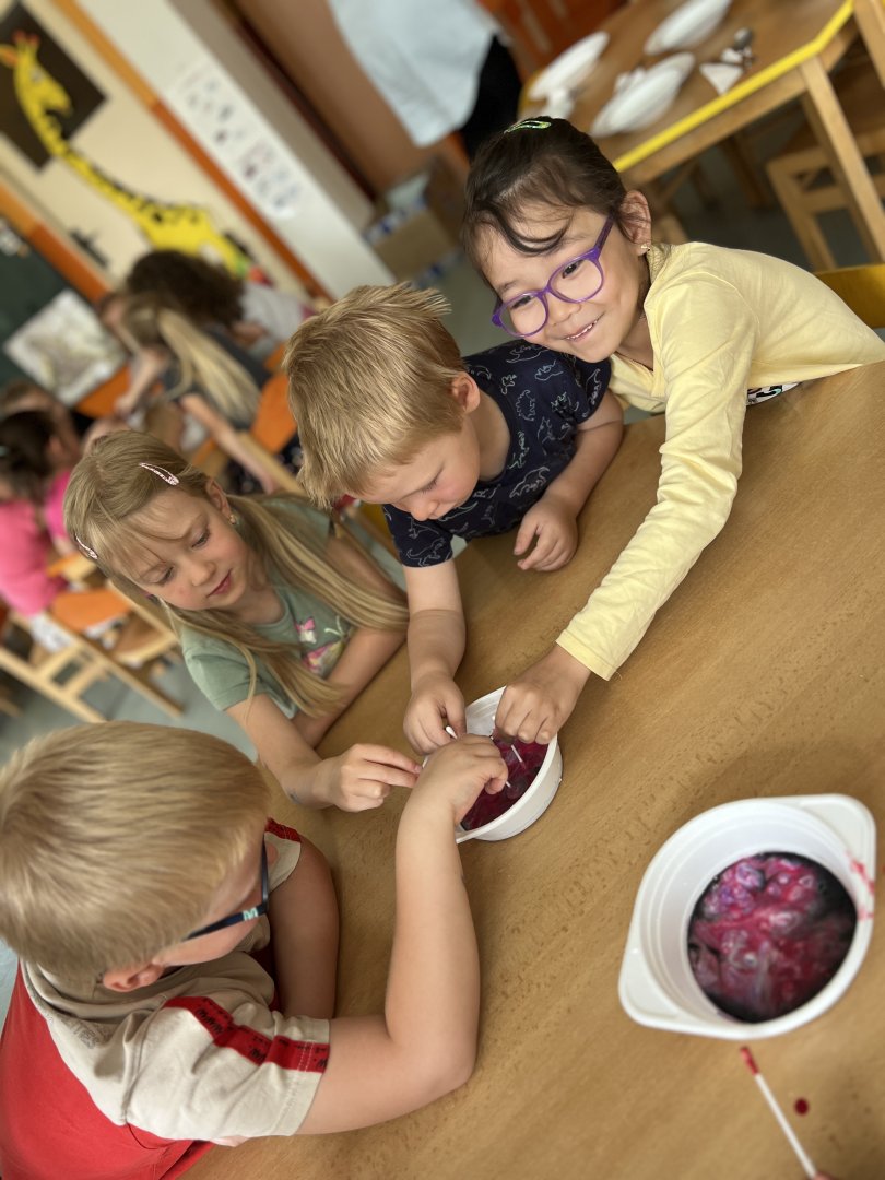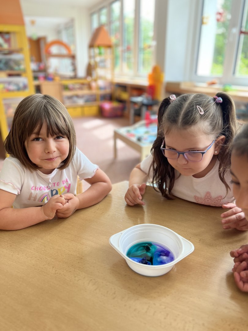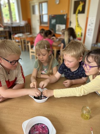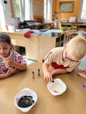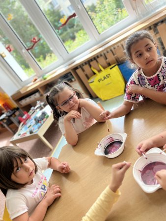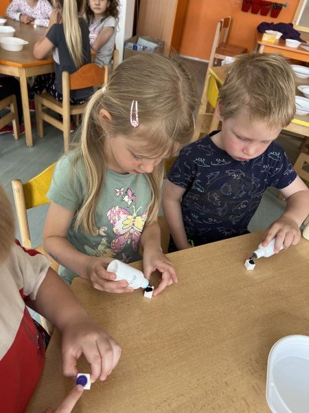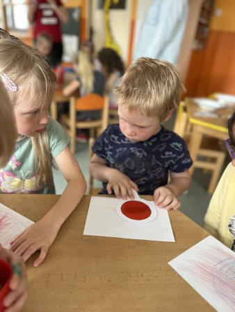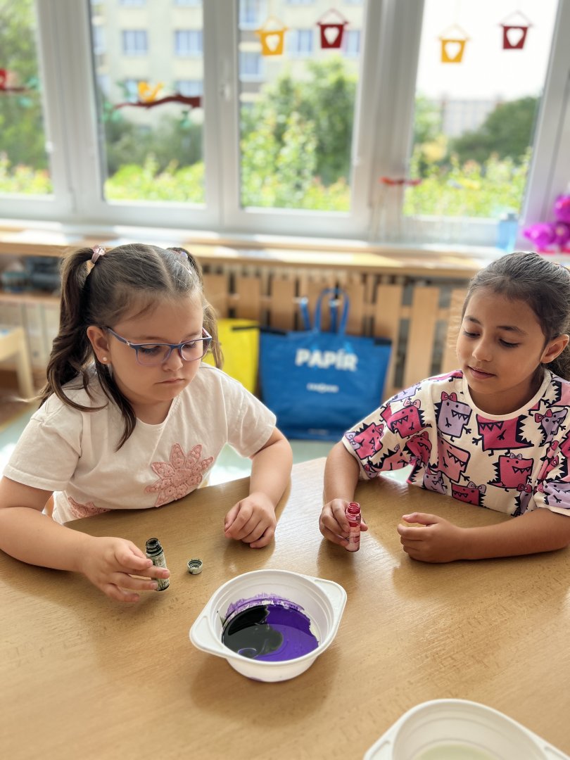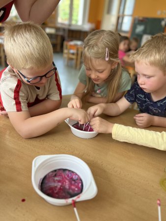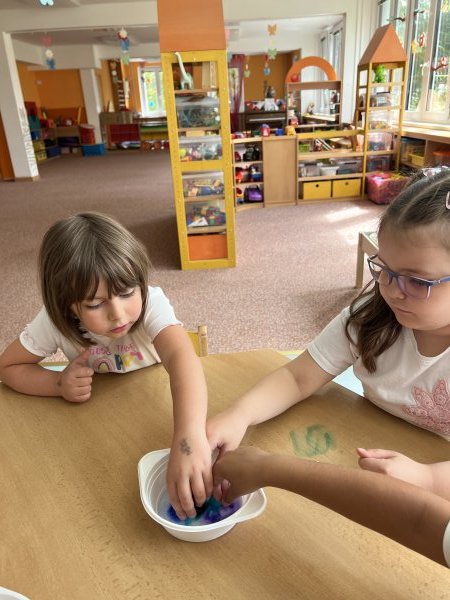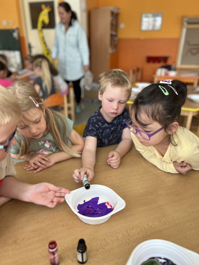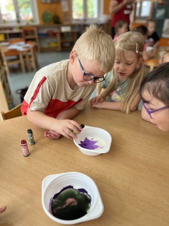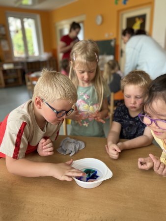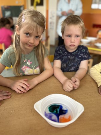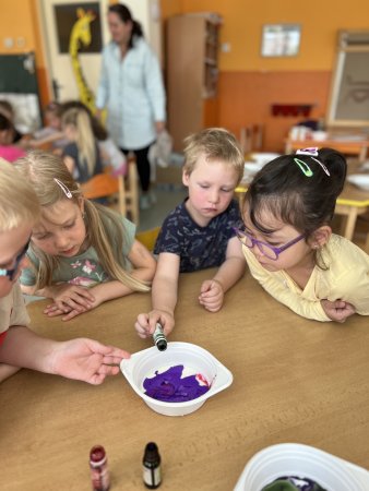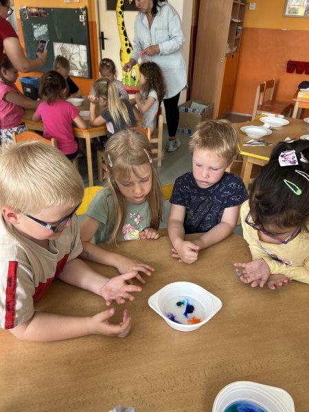 Ve školce byl workshop pro předškoláky zaměřený na barvy a pokusy s nimi. Děti si mohly vyzkoušet zajímavé pokusy s mícháním barev, jejich rozpíjením ve vodě, v mléce a taky kouzlo kdy nakreslí obrázek, překryjí ho červenou pastelkou a poté ho znovu uvidí díky kouzelné červené lupě. Dětem se pokusy moc líbily a všechny velmi zaujaly.